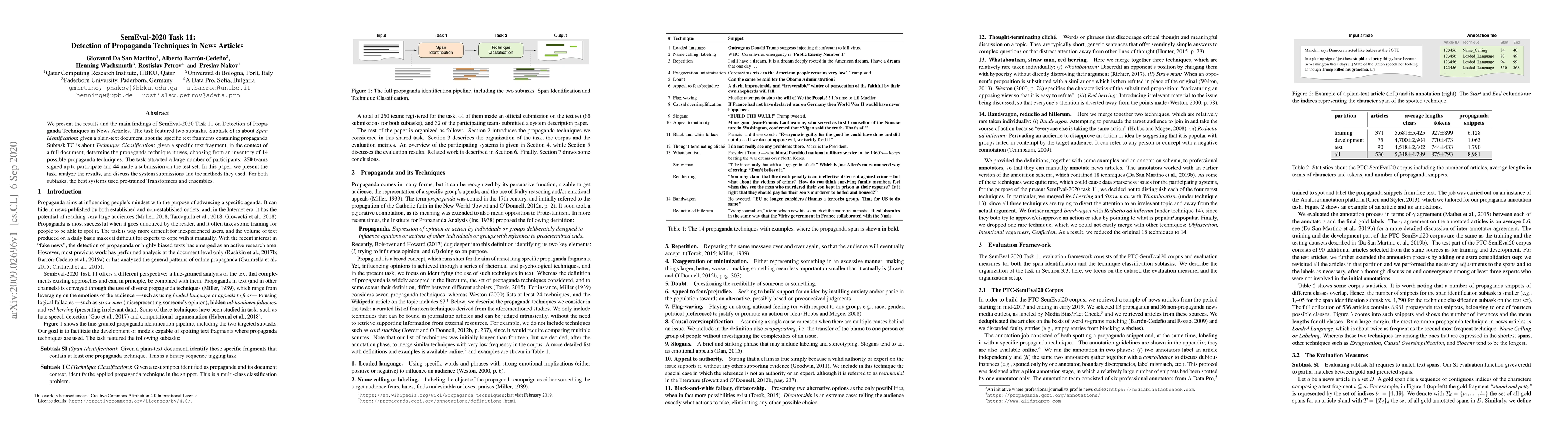 This paper reports on SemEval-2020 Task 11, which focused on detecting propaganda techniques in news articles through two subtasks: Span Identification and Technique Classification. The best performing systems utilized pre-trained Transformers and ensemble methods.
