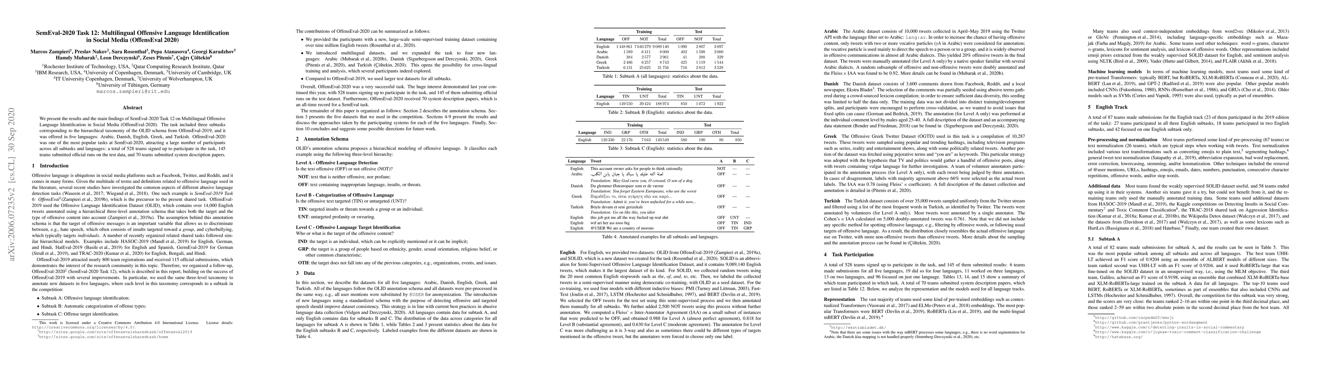 This research paper summarizes the results of SemEval-2020 Task 12 on Multilingual Offensive Language Identification in Social Media, involving five languages and three hierarchical subtasks. With 528 teams participating, it attracted substantial interest and engagement.