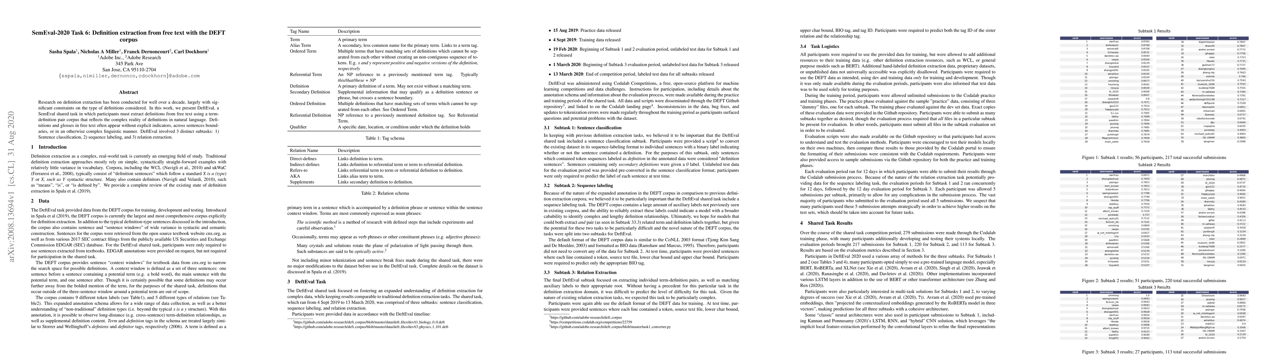 This research paper presents DeftEval, a SemEval shared task that challenges participants to extract definitions from free text using a complex term-definition pair corpus. It involves three subtasks: sentence classification, sequence labeling, and relation extraction.