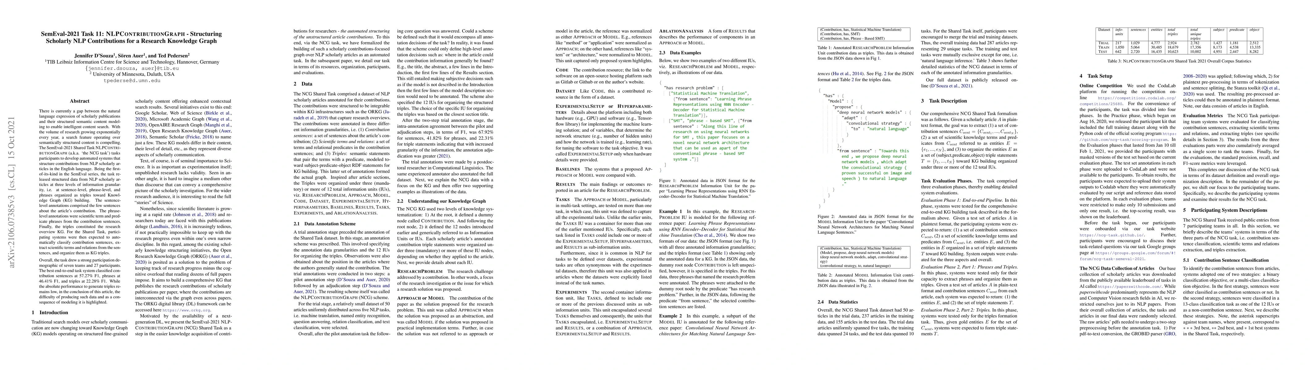 There is currently a gap between the natural language expression of scholarly publications and their structured semantic content modeling to enable intelligent content search. With the volume of research growing exponentially every year, a search feature operating over semantically structured content is compelling. The SemEval-2021 Shared Task NLPContributionGraph (a.k.a. 'the NCG task') tasks participants to develop automated systems that structure contributions from NLP scholarly articles in the English language. Being the first-of-its-kind in the SemEval series, the task released structured data from NLP scholarly articles at three levels of information granularity, i.e. at sentence-level, phrase-level, and phrases organized as triples toward Knowledge Graph (KG) building. The sentence-level annotations comprised the few sentences about the article's contribution. The phrase-level annotations were scientific term and predicate phrases from the contribution sentences. Finally, the triples constituted the research overview KG. For the Shared Task, participating systems were then expected to automatically classify contribution sentences, extract scientific terms and relations from the sentences, and organize them as KG triples. Overall, the task drew a strong participation demographic of seven teams and 27 participants. The best end-to-end task system classified contribution sentences at 57.27% F1, phrases at 46.41% F1, and triples at 22.28% F1. While the absolute performance to generate triples remains low, in the conclusion of this article, the difficulty of producing such data and as a consequence of modeling it is highlighted.