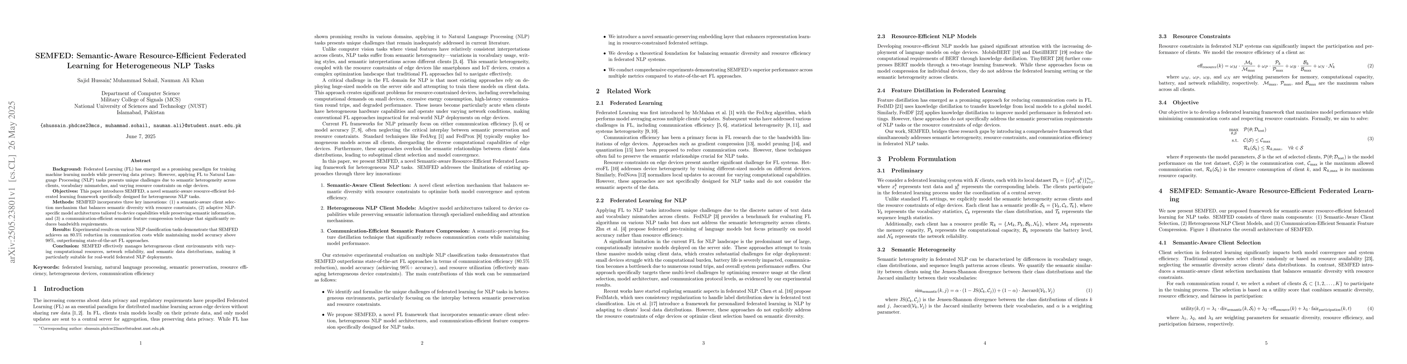 This paper introduces SEMFED, a semantic-aware resource-efficient federated learning framework for heterogeneous NLP tasks, incorporating semantic-aware client selection, adaptive NLP-specific model architectures, and communication-efficient semantic feature compression techniques.