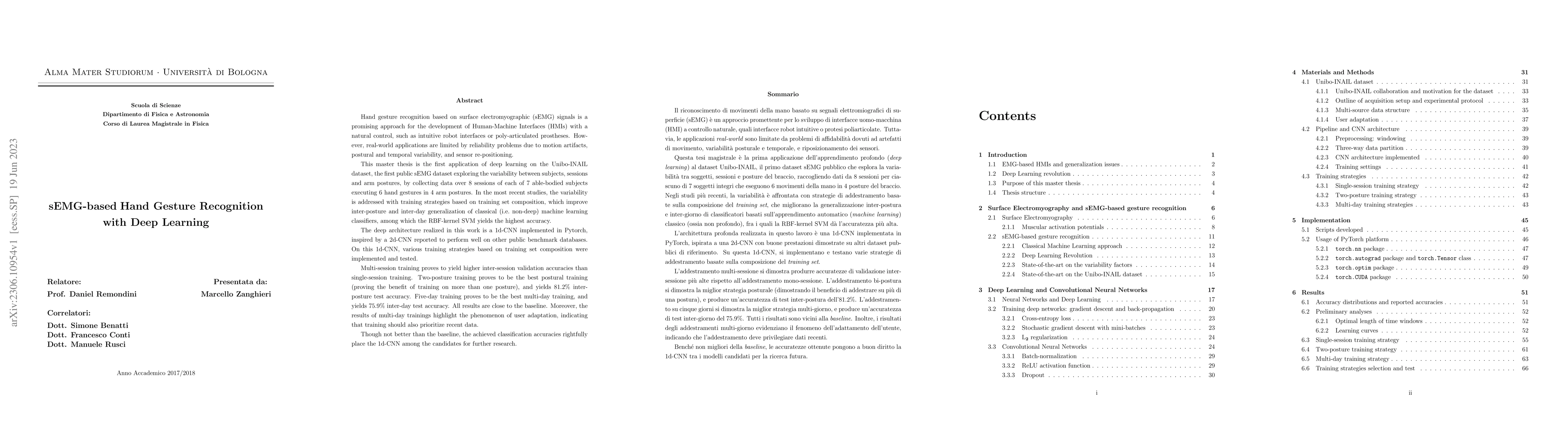 Hand gesture recognition based on surface electromyographic (sEMG) signals is a promising approach for developing Human-Machine Interfaces (HMIs) with a natural control, such as intuitive robot interfaces or poly-articulated prostheses. However, real-world applications are limited by reliability problems due to motion artefacts, postural and temporal variability, and sensor re-positioning. This master thesis is the first application of deep learning on the Unibo-INAIL dataset, the first public sEMG dataset exploring the variability between subjects, sessions and arm postures by collecting data over 8 sessions of each of 7 able-bodied subjects executing 6 hand gestures in 4 arm postures. Recent studies address variability with strategies based on training set composition, which improve inter-posture and inter-day generalization of non-deep machine learning classifiers, among which the RBF-kernel SVM yields the highest accuracy. The deep architecture realized in this work is a 1d-CNN inspired by a 2d-CNN reported to perform well on other public benchmark databases. On this 1d-CNN, various training strategies based on training set composition were implemented and tested. Multi-session training proves to yield higher inter-session validation accuracies than single-session training. Two-posture training proves the best postural training (proving the benefit of training on more than one posture) and yields 81.2% inter-posture test accuracy. Five-day training proves the best multi-day training, yielding 75.9% inter-day test accuracy. All results are close to the baseline. Moreover, the results of multi-day training highlight the phenomenon of user adaptation, indicating that training should also prioritize recent data. Though not better than the baseline, the achieved classification accuracies rightfully place the 1d-CNN among the candidates for further research.