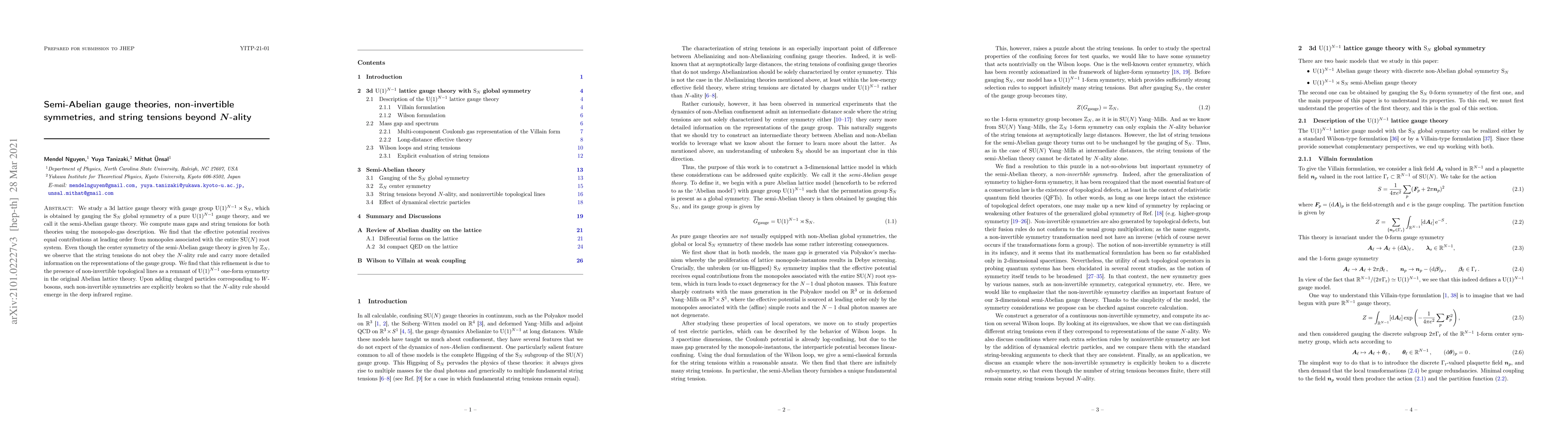 We study a 3d lattice gauge theory with gauge group $\mathrm{U}(1)^{N-1}\rtimes \mathrm{S}_N$, which is obtained by gauging the $\mathrm{S}_N$ global symmetry of a pure $\mathrm{U}(1)^{N-1}$ gauge theory, and we call it the semi-Abelian gauge theory. We compute mass gaps and string tensions for both theories using the monopole-gas description. We find that the effective potential receives equal contributions at leading order from monopoles associated with the entire $\mathrm{SU}(N)$ root system. Even though the center symmetry of the semi-Abelian gauge theory is given by $\mathbb{Z}_N$, we observe that the string tensions do not obey the $N$-ality rule and carry more detailed information on the representations of the gauge group. We find that this refinement is due to the presence of non-invertible topological lines as a remnant of $\mathrm{U}(1)^{N-1}$ one-form symmetry in the original Abelian lattice theory. Upon adding charged particles corresponding to $W$-bosons, such non-invertible symmetries are explicitly broken so that the $N$-ality rule should emerge in the deep infrared regime.