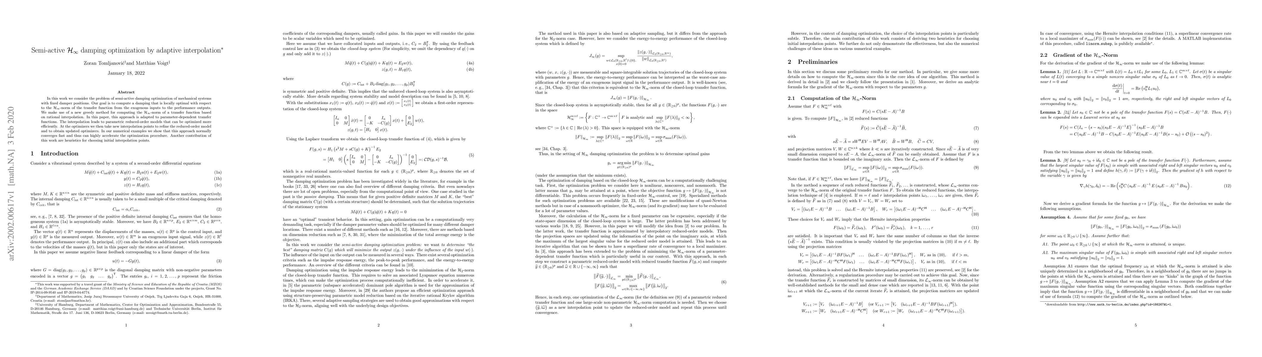 This research introduces a greedy method for calculating H_∞ norm of transfer functions with parameter-dependent models, using rational interpolation for semi-active damping optimization in mechanical systems with fixed damper positions. The method efficiently updates optimizers through new interpolation points, demonstrating fast convergence in numerical examples, and offers heuristics for initial point selection.