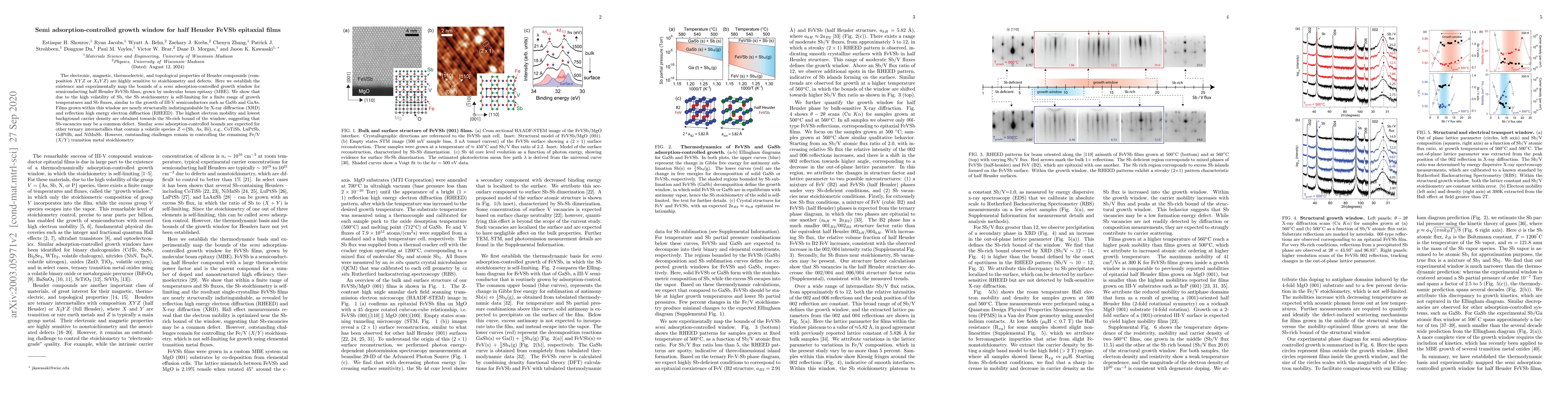 This paper establishes a semi-adsorption-controlled growth window for semiconducting half Heusler FeVSb films grown by MBE, revealing that Sb stoichiometry is self-limiting due to its high volatility. Films within this window exhibit optimal electron mobility and low carrier density, indicating Sb-vacancies as a common defect.