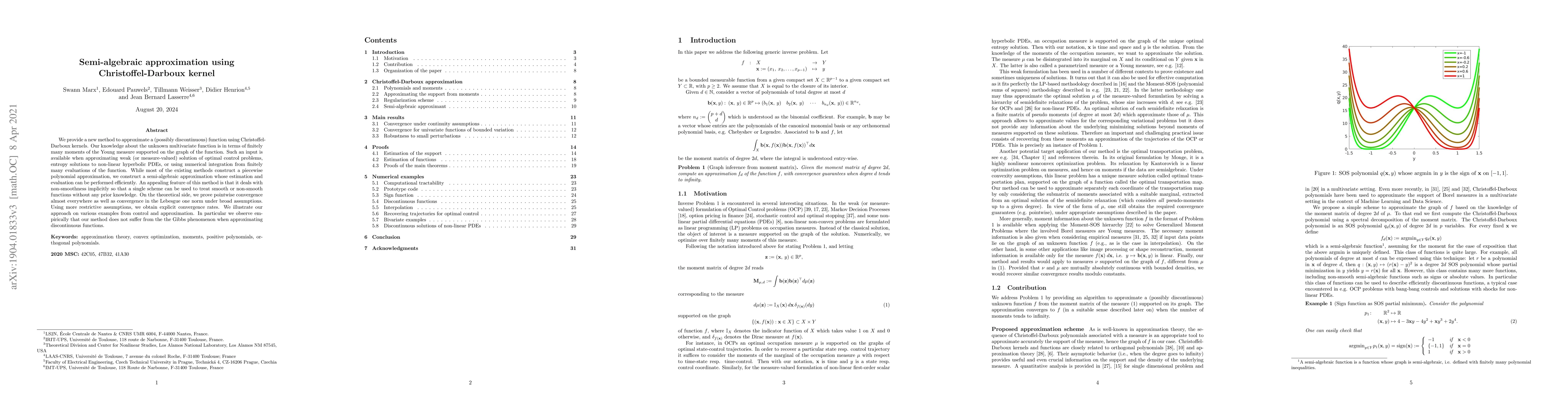 We provide a new method to approximate a (possibly discontinuous) function using Christoffel-Darboux kernels. Our knowledge about the unknown multivariate function is in terms of finitely many moments of the Young measure supported on the graph of the function. Such an input is available when approximating weak (or measure-valued) solution of optimal control problems, entropy solutions to non-linear hyperbolic PDEs, or using numerical integration from finitely many evaluations of the function. While most of the existing methods construct a piecewise polynomial approximation, we construct a semi-algebraic approximation whose estimation and evaluation can be performed efficiently. An appealing feature of this method is that it deals with non-smoothness implicitly so that a single scheme can be used to treat smooth or non-smooth functions without any prior knowledge. On the theoretical side, we prove pointwise convergence almost everywhere as well as convergence in the Lebesgue one norm under broad assumptions. Using more restrictive assumptions, we obtain explicit convergence rates. We illustrate our approach on various examples from control and approximation. In particular we observe empirically that our method does not suffer from the the Gibbs phenomenon when approximating discontinuous functions.