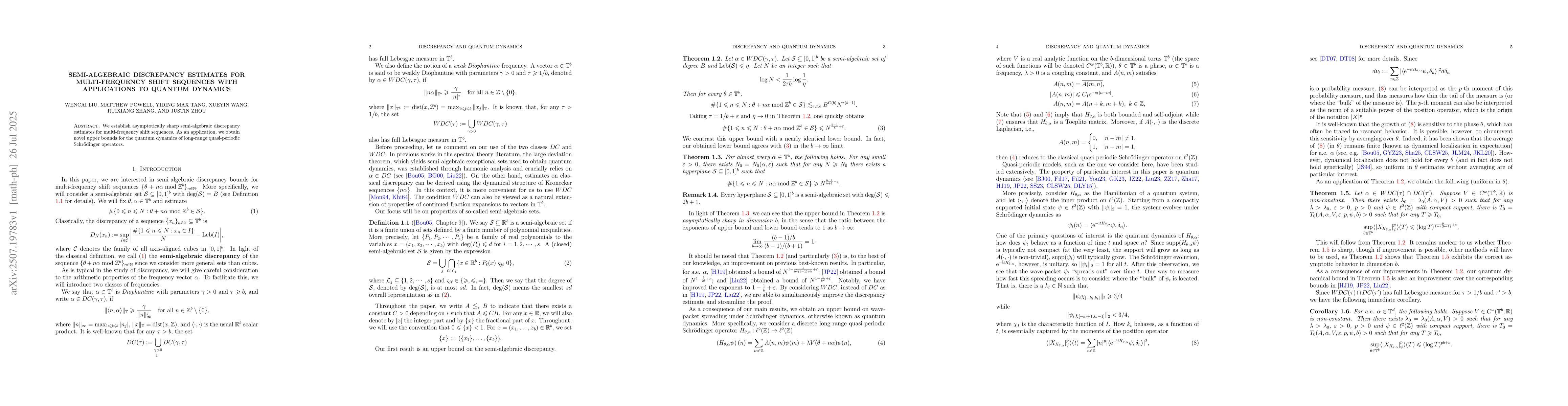 We establish asymptotically sharp semi-algebraic discrepancy estimates for multi-frequency shift sequences. As an application, we obtain novel upper bounds for the quantum dynamics of long-range quasi-periodic Schr\"odinger operators.
