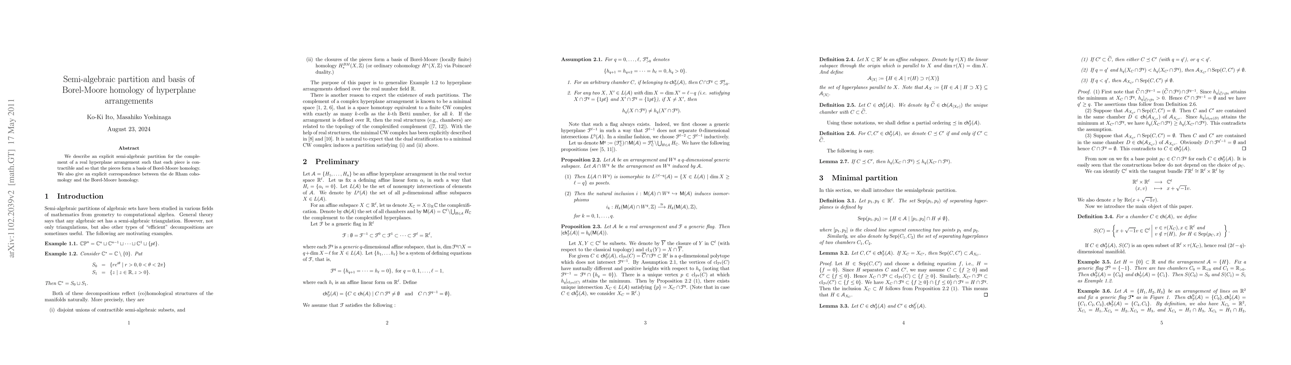 The paper describes a semi-algebraic partition for the complement of a real hyperplane arrangement, ensuring each piece is contractible and forms a basis of Borel-Moore homology. It also establishes an explicit correspondence between de Rham cohomology and Borel-Moore homology.