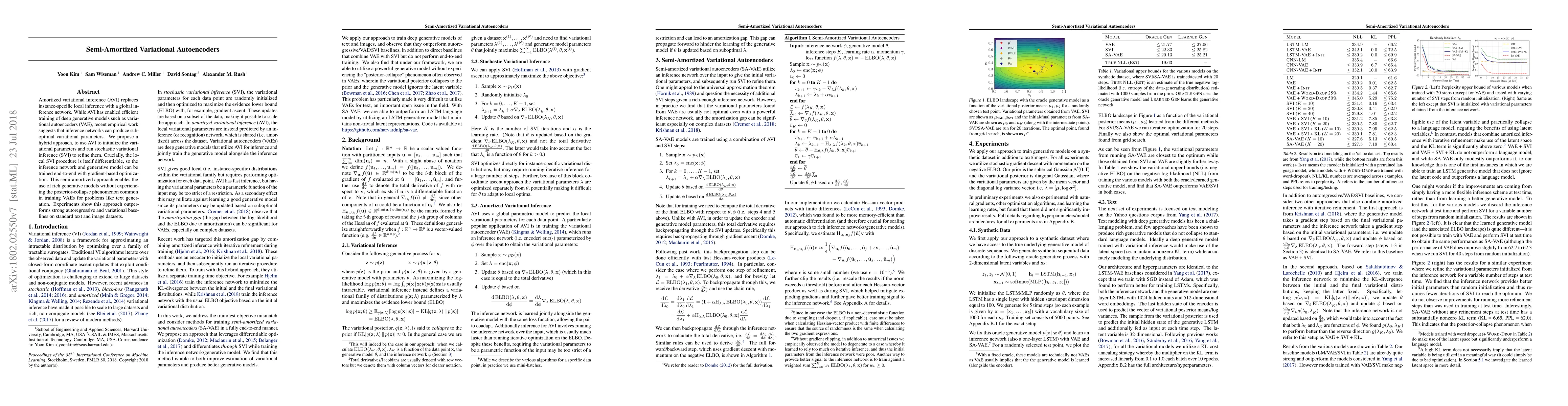 This paper proposes a semi-amortized variational autoencoder approach that uses amortized variational inference to initialize variational parameters and stochastic variational inference to refine them, achieving better performance and avoiding posterior collapse compared to traditional VAEs. This hybrid method is end-to-end differentiable and outperforms other generative models on text and image datasets.