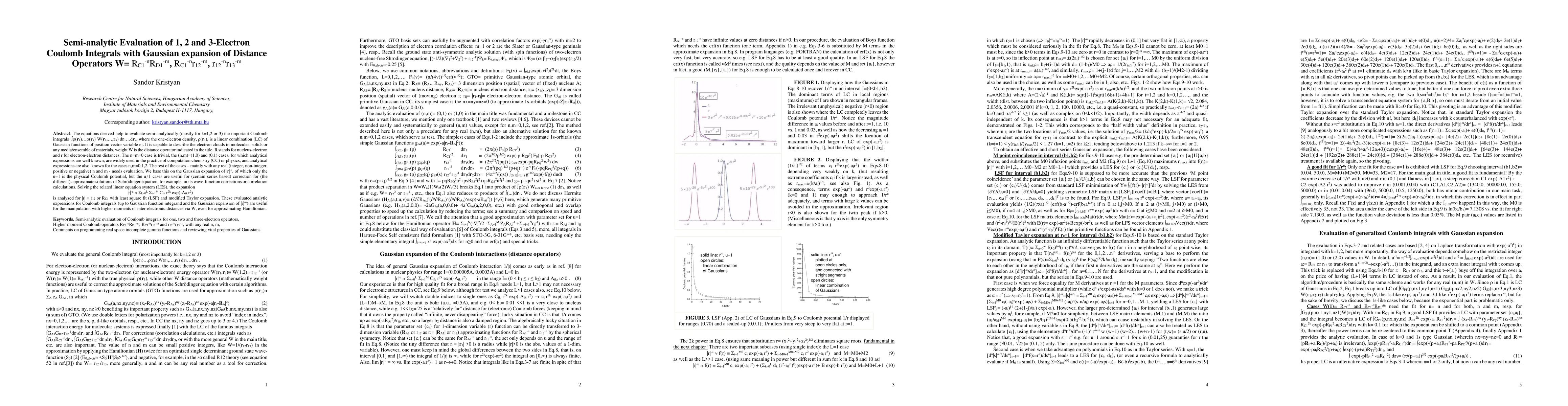The equations derived help to evaluate semi-analytically (mostly for k=1,2 or 3) the important Coulomb integrals Int rho(r1)...rho(rk) W(r1,...,rk) dr1...drk, where the one-electron density, rho(r1), is a linear combination (LC) of Gaussian functions of position vector variable r1. It is capable to describe the electron clouds in molecules, solids or any media/ensemble of materials, weight W is the distance operator indicated in the title. R stands for nucleus-electron and r for electron-electron distances. The n=m=0 case is trivial, the (n,m)=(1,0) and (0,1) cases, for which analytical expressions are well known, are widely used in the practice of computation chemistry (CC) or physics, and analytical expressions are also known for the cases n,m=0,1,2. The rest of the cases - mainly with any real (integer, non-integer, positive or negative) n and m - needs evaluation. We base this on the Gaussian expansion of |r|^-u, of which only the u=1 is the physical Coulomb potential, but the u.ne.1 cases are useful for (certain series based) correction for (the different) approximate solutions of Schrodinger equation, for example, in its wave-function corrections or correlation calculations. Solving the related linear equation system (LES), the expansion |r|^-u about equal to SUM(k=0toL)SUM(i=1toM) Cik r^2k exp(-Aik r^2) is analyzed for |r| = r12 or RC1 with least square fit (LSF) and modified Taylor expansion. These evaluated analytic expressions for Coulomb integrals (up to Gaussian function integrand and the Gaussian expansion of |r|^-u) are useful for the manipulation with higher moments of inter-electronic distances via W, even for approximating Hamiltonian.