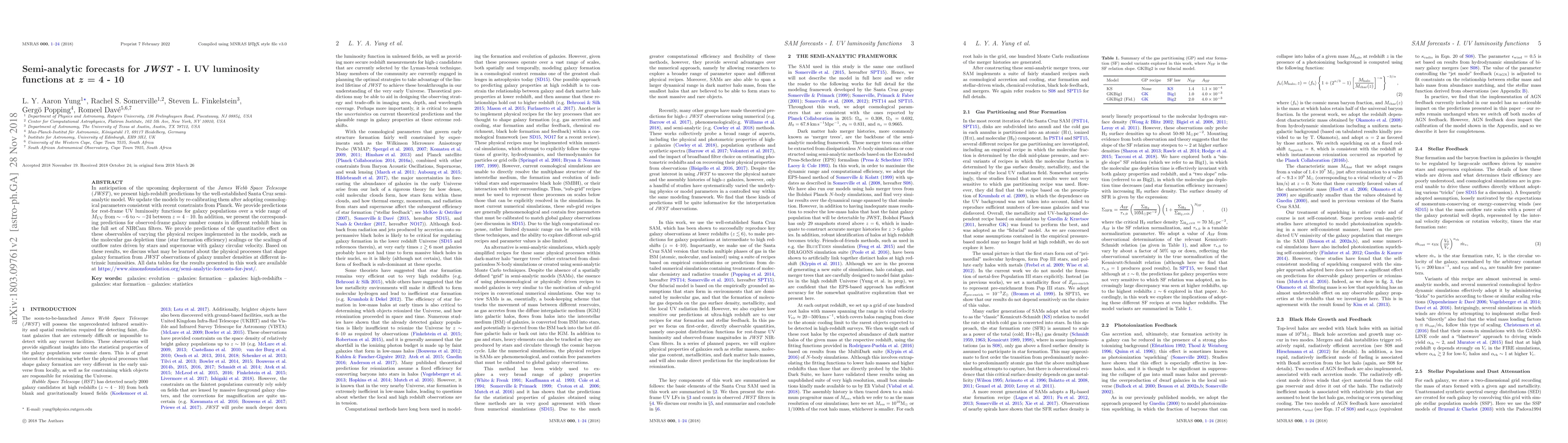 In anticipation of the upcoming deployment of the James Webb Space Telescope (JWST), we present high-redshift predictions by the well-established Santa Cruz semi-analytic model. We update the models by re-calibrating them after adopting cosmological parameters consistent with recent constraints from Planck. We provide predictions for rest-frame UV luminosity functions for galaxy populations over a wide range of $M_\text{UV}$ from $\sim-6$ to $\sim-24$ between $z = 4 - 10$. In addition, we present the corresponding predictions for observed-frame galaxy number counts in different redshift bins in the full set of NIRCam filters. We provide predictions of the quantitative effect on these observables of varying the physical recipes implemented in the models, such as the molecular gas depletion time (star formation efficiency) scalings or the scalings of outflow rates driven by stars and supernovae with galaxy circular velocity. Based on these results, we discuss what may be learned about the physical processes that shape galaxy formation from JWST observations of galaxy number densities at different intrinsic luminosities. All data tables for the results presented in this work are available at https://www.simonsfoundation.org/semi-analytic-forecasts-for-jwst/.