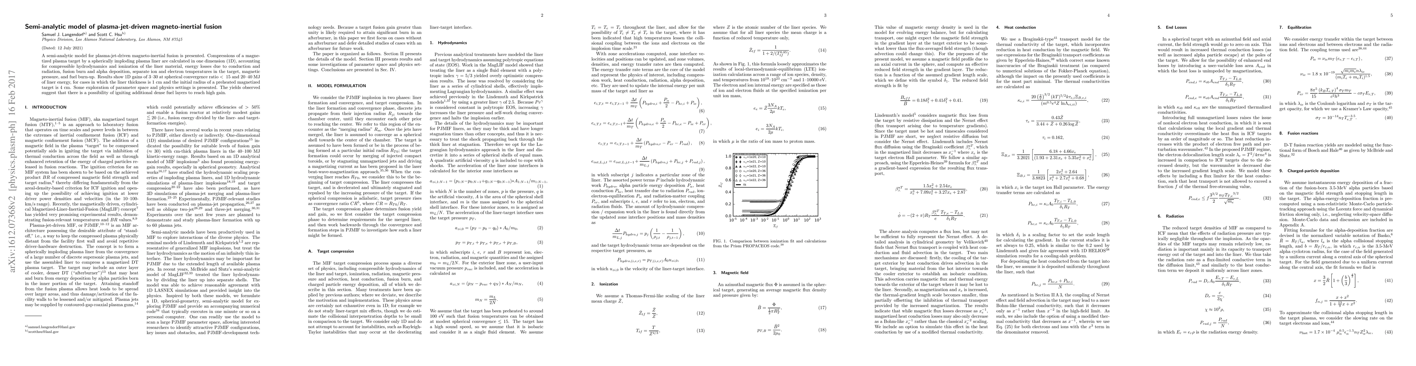 This paper presents a semi-analytic model for plasma-jet-driven magneto-inertial fusion, detailing 1D calculations of a magnetized plasma target compressed by an imploding plasma liner. The study explores various physical processes and finds potential for high gains, suggesting the possibility of igniting additional dense fuel layers.