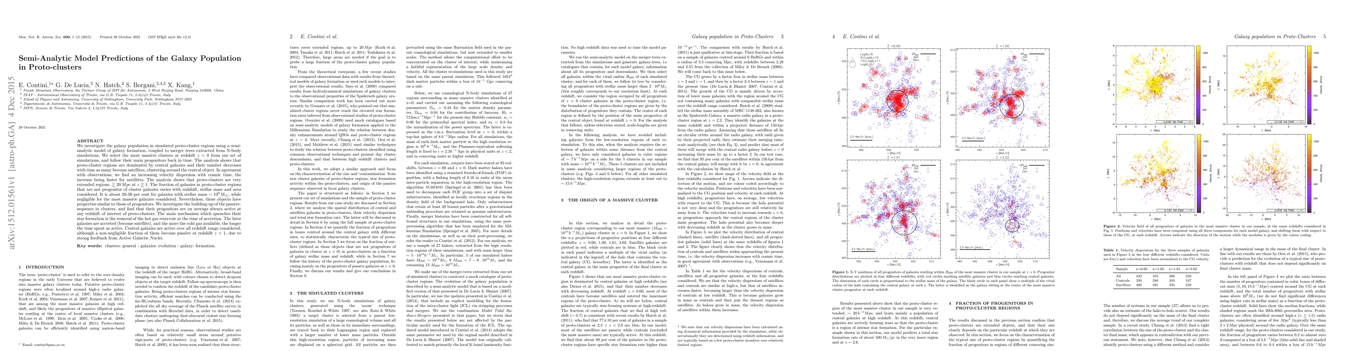 This paper uses a semi-analytic model to study galaxy populations in proto-cluster regions, finding that central galaxies dominate and many evolve into satellite galaxies over time. The study reveals a significant increase in velocity dispersion with cosmic time, especially for satellites, and shows that proto-clusters are large, extended regions.