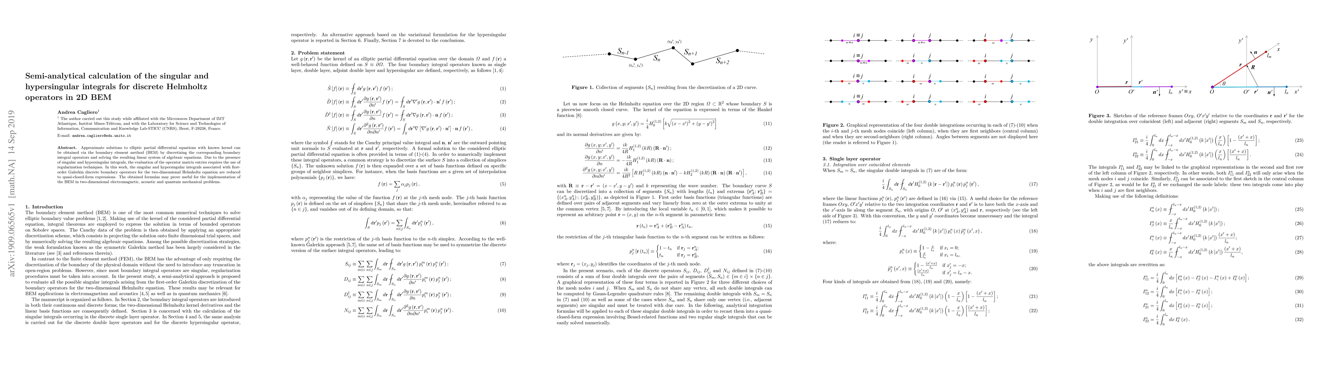 This paper presents semi-analytical methods for evaluating singular and hypersingular integrals in the boundary element method (BEM) for solving elliptic partial differential equations. The study focuses on reducing these integrals to quasi-closed-form expressions for first-order Galerkin discrete boundary operators in 2D Helmholtz problems, which can enhance the implementation of BEM in electromagnetic, acoustic, and quantum mechanical applications.