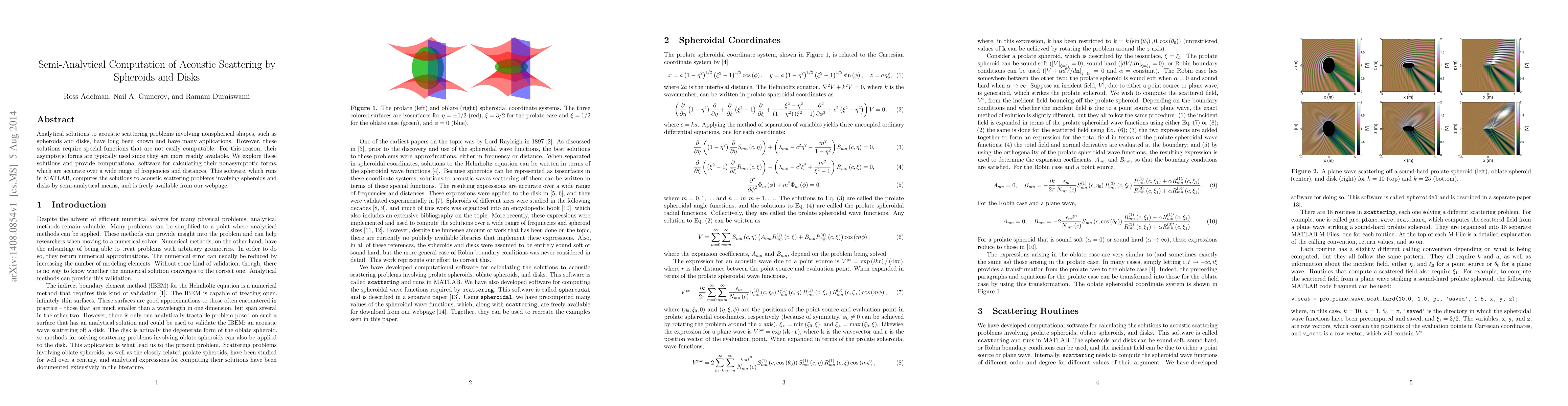 Analytical solutions to acoustic scattering problems involving nonspherical shapes, such as spheroids and disks, have long been known and have many applications. However, these solutions require special functions that are not easily computable. For this reason, their asymptotic forms are typically used since they are more readily available. We explore these solutions and provide computational software for calculating their nonasymptotic forms, which are accurate over a wide range of frequencies and distances. This software, which runs in MATLAB, computes the solutions to acoustic scattering problems involving spheroids and disks by semi-analytical means, and is freely available from our webpage.