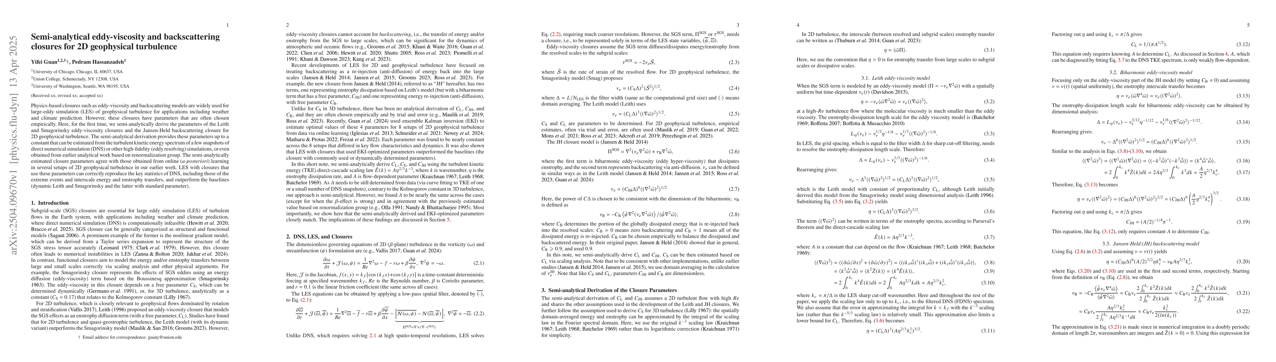 The paper presents a novel semi-analytical approach to determine closure parameters for eddy-viscosity and backscattering models in geophysical turbulence LES.