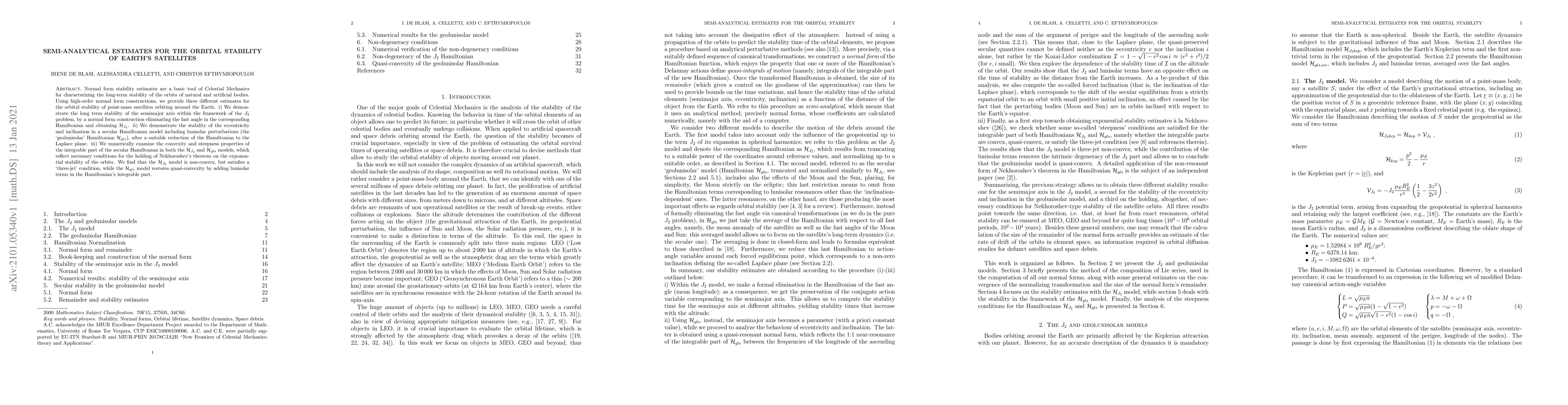 This paper provides semi-analytical estimates for the orbital stability of Earth's satellites using high-order normal form constructions. It demonstrates the long-term stability of the semimajor axis, eccentricity, and inclination, and finds that while the $H_{J_2}$ model is non-convex, the $H_{gls}$ model restores quasi-convexity through lunisolar perturbations.