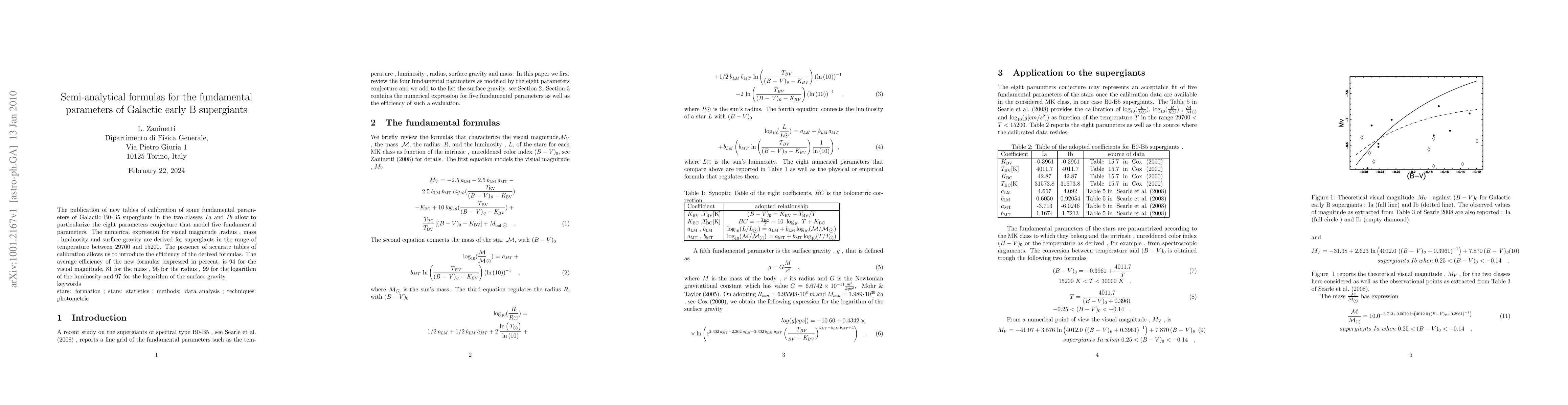 This research derives semi-analytical formulas for the fundamental parameters of cool to warm Galactic early B supergiants, including visual magnitude, radius, mass, luminosity, and surface gravity. These formulas, validated by new calibration tables, provide precise modeling for B0-B5 supergiants within a temperature range of 29700 to 15200 K.