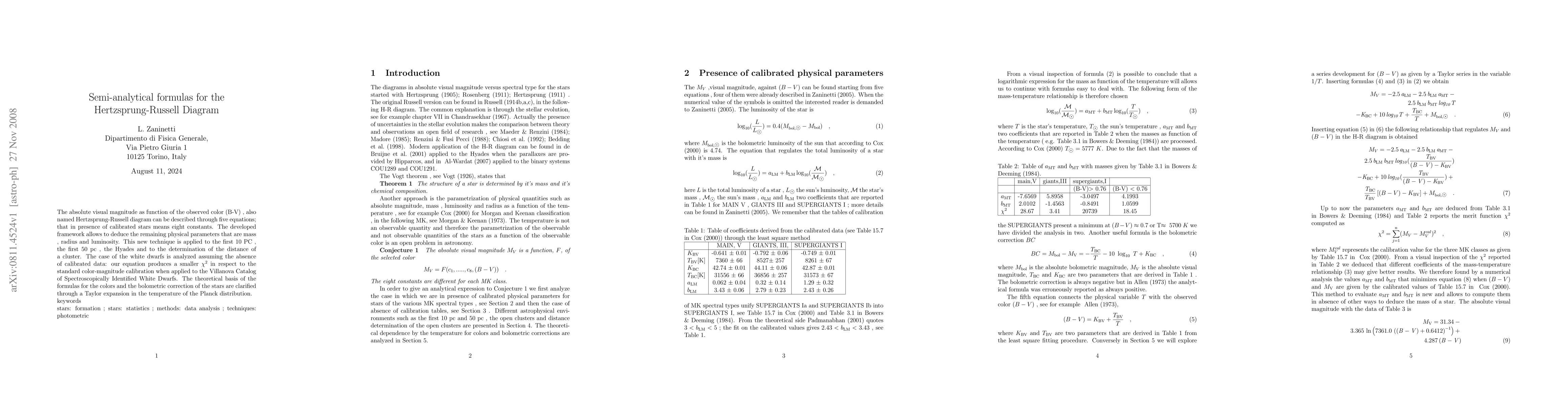 This paper presents semi-analytical formulas for the Hertzsprung-Russell diagram, enabling the deduction of mass, radius, and luminosity from absolute visual magnitude and colour. The method is validated through application to various star clusters and shows improved accuracy for white dwarfs compared to standard calibrations.