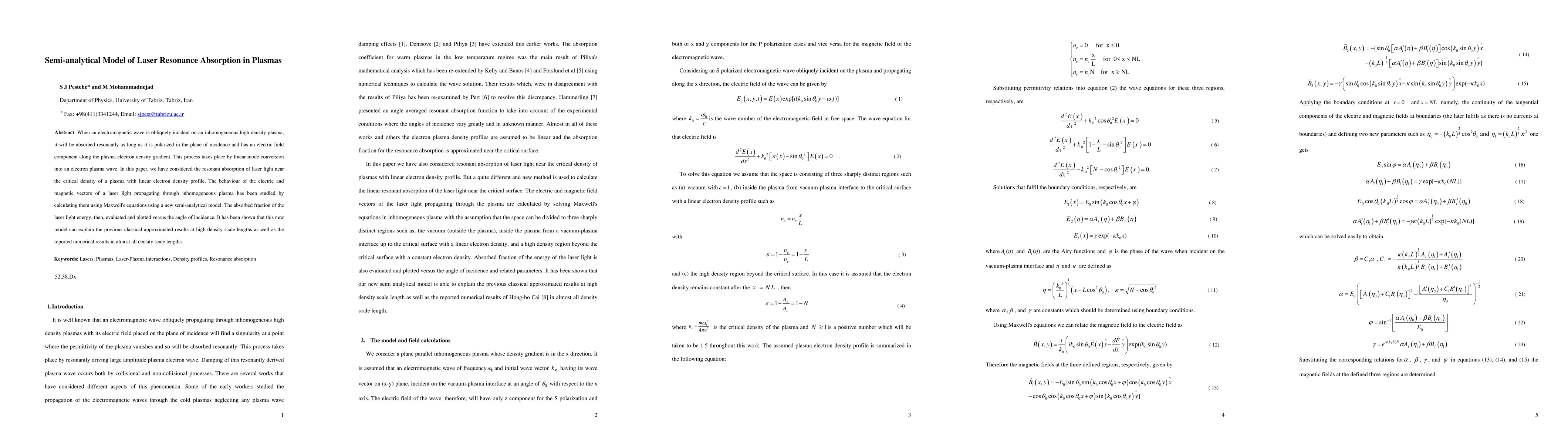 When an electromagnetic wave is obliquely incident on an inhomogeneous high density plasma, it will be absorbed resonantly as long as it is polarized in the plane of incidence and has an electric field component along the plasma electron density gradient. This process takes place by linear mode conversion into an electron plasma wave. In this paper, we have considered the resonant absorption of laser light near the critical density of a plasma with linear electron density profile. The behaviour of the electric and magnetic vectors of a laser light propagating through inhomogeneous plasma has been studied by calculating them using Maxwell's equations using a new semi-analytical model. The absorbed fraction of the laser light energy, then, evaluated and plotted versus the angle of incidence. It has been shown that this new model can explain the previous classical approximated results at high density scale lengths as well as the reported numerical results in almost all density scale lengths.