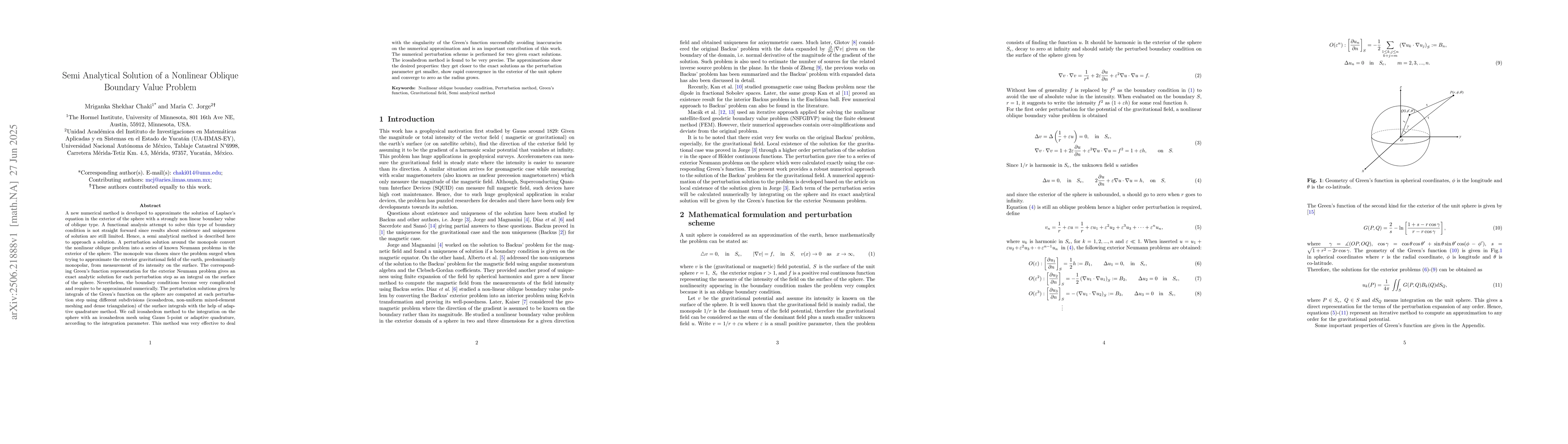 A new numerical method is developed to approximate the solution of Laplace's equation in the exterior of the sphere with a strongly nonlinear boundary value of oblique type. A functional analysis attempt to solve this type of boundary condition is not straight forward since results about existence and uniqueness of solution are still limited. Hence, a semi analytical method is described here to approach a solution. A perturbation solution around the monopole converts the nonlinear oblique problem into a series of known Neumann problems in the exterior of the sphere. The corresponding Green's function representation for the exterior Neumann problem gives an exact analytic solution for each perturbation step as an integral on the surface of the sphere. Nevertheless, the boundary conditions become very complicated and require to be approximated numerically. The perturbation solutions given by integrals of the Green's function on the sphere are computed at each perturbation step using different subdivisions of the surface integrals with the help of adaptive quadrature method. We call icosahedron method to the integration on the sphere with an icosahedron mesh using Gauss 5-point or adaptive quadrature, according to the integration parameter. This method was very effective to deal with the singularity of the Green's function successfully avoiding inaccuracies on the numerical approximation and is an important contribution of this work. The numerical perturbation scheme is performed for two given exact solutions. The icosahedron method is found to be very precise. The approximations show the desired properties: they get closer to the exact solutions as the perturbation parameter gets smaller, show rapid convergence in the exterior of the unit sphere and converge to zero as the radius grows.