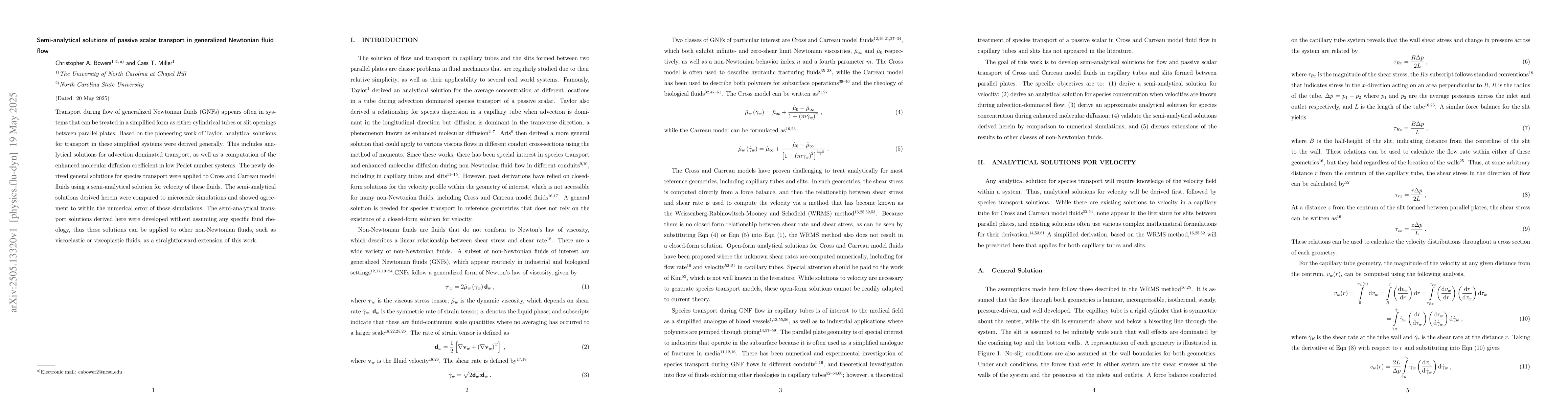 The research derives semi-analytical solutions for passive scalar transport in generalized Newtonian fluid flow, applying them to Cross and Carreau model fluids and comparing with microscale simulations.