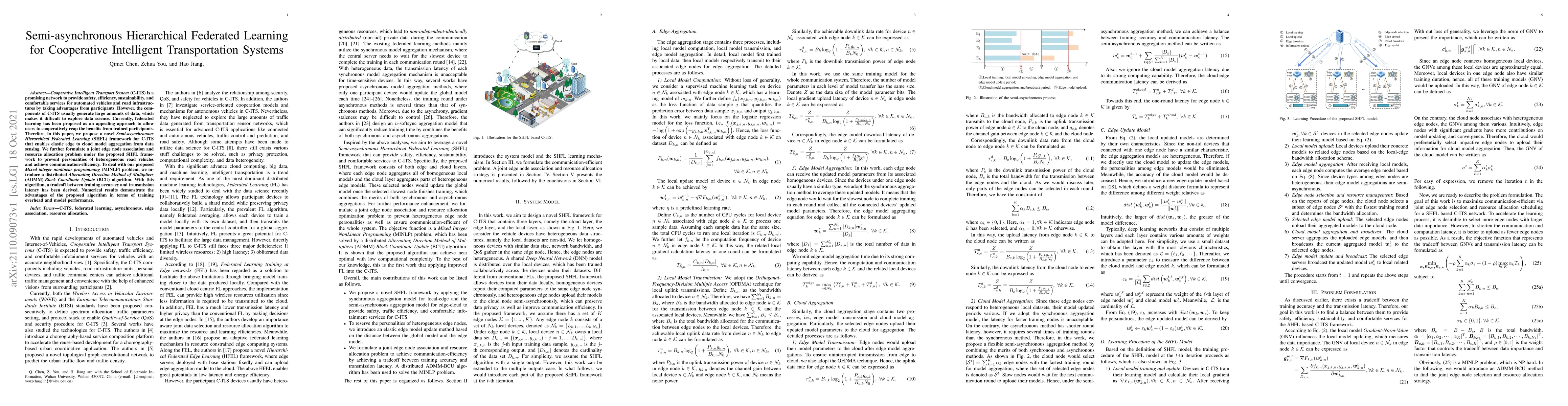 This paper proposes a Semi-asynchronous Hierarchical Federated Learning (SHFL) framework for Cooperative Intelligent Transportation Systems (C-ITS) to efficiently aggregate data from edge to cloud. It introduces a distributed ADMM-BCU algorithm to solve a joint edge node association and resource allocation problem, achieving a balance between training accuracy and transmission latency.