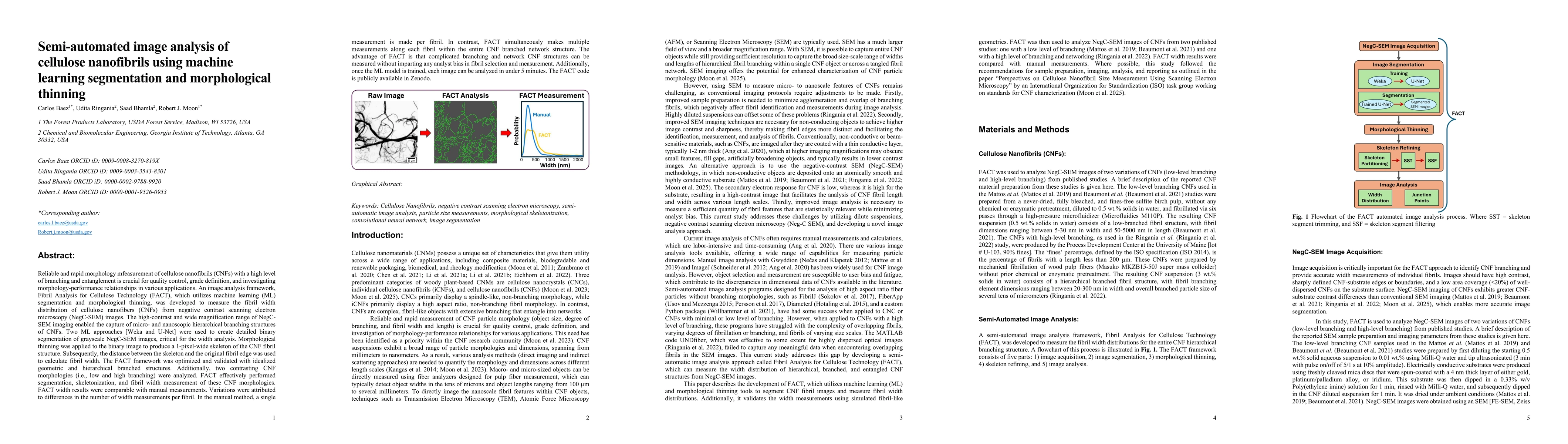 Reliable and rapid morphology measurement of cellulose nanofibrils (CNFs) with a high level of branching and entanglement is crucial for quality control, grade definition, and investigating morphology-performance relationships in various applications. An image analysis framework, Fibril Analysis for Cellulose Technology (FACT), which utilizes machine learning (ML) segmentation and morphological thinning, was developed to measure the fibril width distribution of cellulose nanofibers (CNFs) from negative contrast scanning electron microscopy (NegC-SEM) images. The high-contrast and wide magnification range of NegC-SEM imaging enabled the capture of micro- and nanoscopic hierarchical branching structures of CNFs. Two ML approaches [Weka and U-Net] were used to create detailed binary segmentation of grayscale NegC-SEM images, critical for the width analysis. Morphological thinning was applied to the binary image to produce a 1-pixel-wide skeleton of the CNF fibril structure. Subsequently, the distance between the skeleton and the original fibril edge was used to calculate fibril width. The FACT framework was optimized and validated with idealized geometric and hierarchical branched structures. FACT effectively performed segmentation, skeletonization, and fibril width measurement of these CNF morphologies. FACT width results were comparable with manual measurements. In the manual method, a single measurement is made per fibril. In contrast, FACT simultaneously makes multiple measurements along each fibril within the entire CNF branched network structure. The advantage of FACT is that complicated branching and network CNF structures can be measured without imparting any analyst bias in fibril selection and measurement. Additionally, once the ML model is trained, each image can be analyzed in under 5 minutes.