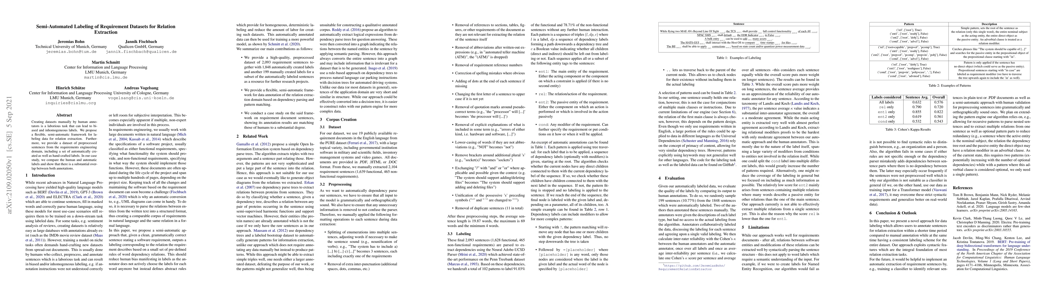 Creating datasets manually by human annotators is a laborious task that can lead to biased and inhomogeneous labels. We propose a flexible, semi-automatic framework for labeling data for relation extraction. Furthermore, we provide a dataset of preprocessed sentences from the requirements engineering domain, including a set of automatically created as well as hand-crafted labels. In our case study, we compare the human and automatic labels and show that there is a substantial overlap between both annotations.