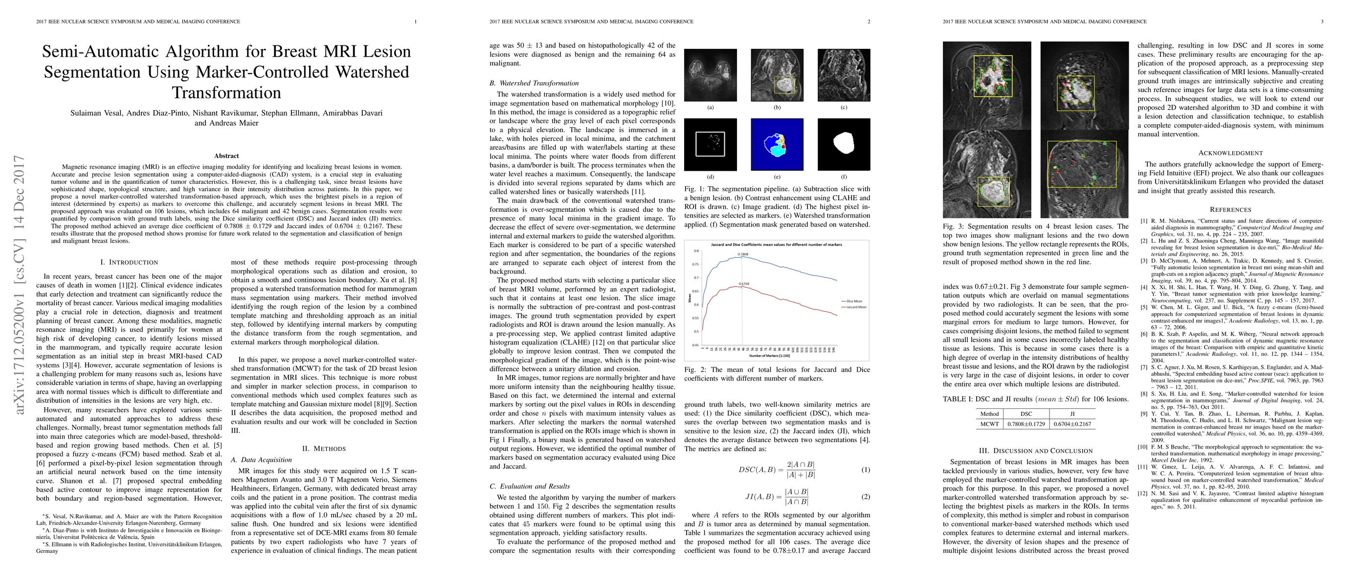 This paper introduces a semi-automatic algorithm for segmenting breast lesions in MRI using marker-controlled watershed transformation, achieving an average Dice coefficient of 0.7808 and Jaccard index of 0.6704, demonstrating its potential for aiding in the diagnosis and classification of breast lesions.