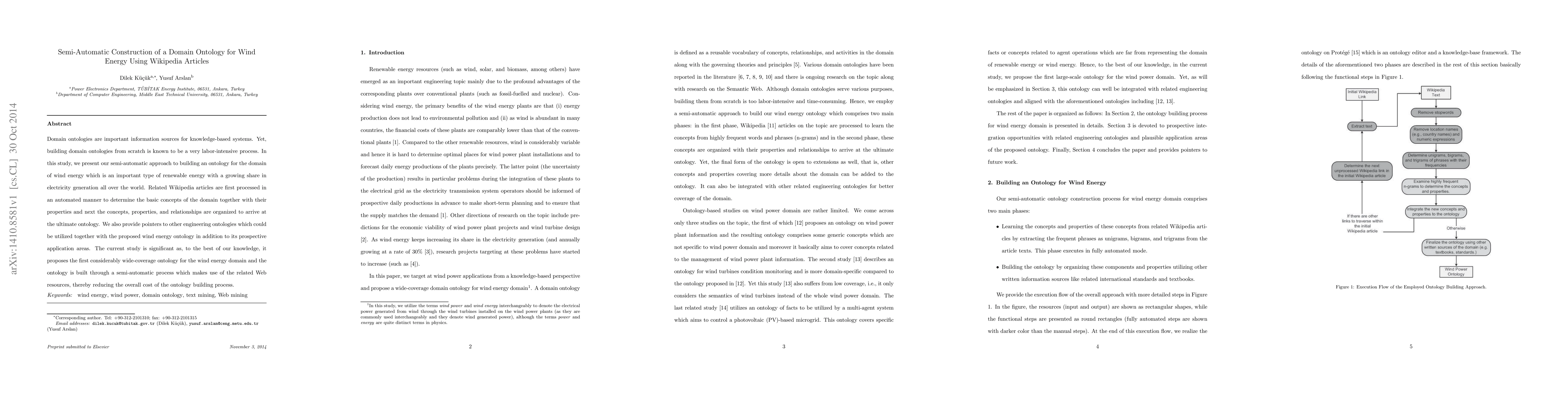 This paper presents a semi-automatic method for constructing a comprehensive domain ontology for wind energy using Wikipedia articles. The approach automates the extraction of concepts and relationships, significantly reducing the labor-intensive nature of traditional ontology building.