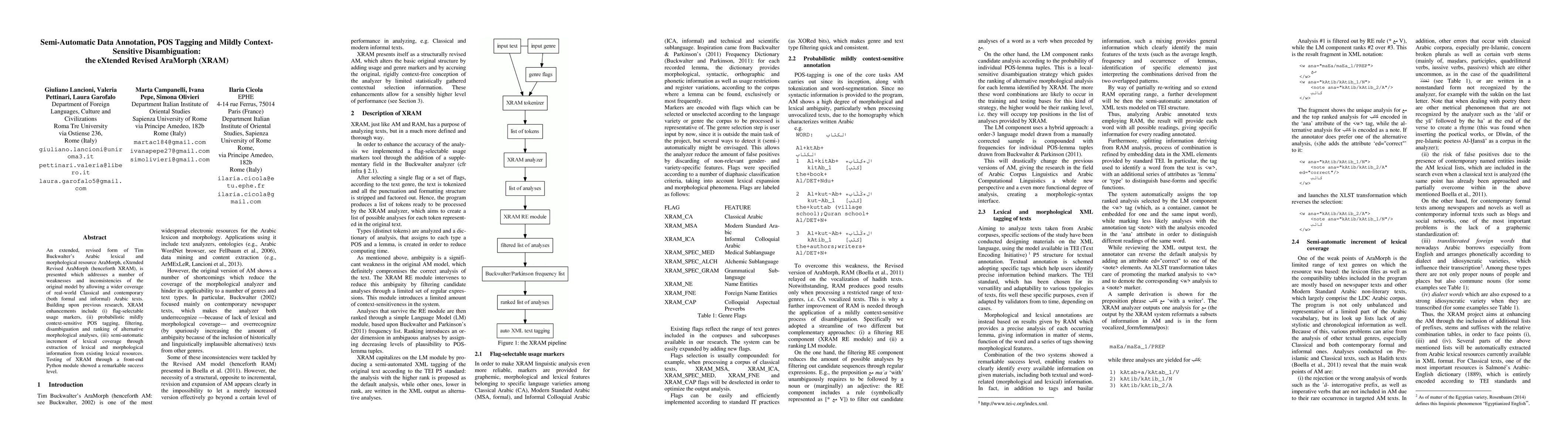 An extended, revised form of Tim Buckwalter's Arabic lexical and morphological resource AraMorph, eXtended Revised AraMorph (henceforth XRAM), is presented which addresses a number of weaknesses and inconsistencies of the original model by allowing a wider coverage of real-world Classical and contemporary (both formal and informal) Arabic texts. Building upon previous research, XRAM enhancements include (i) flag-selectable usage markers, (ii) probabilistic mildly context-sensitive POS tagging, filtering, disambiguation and ranking of alternative morphological analyses, (iii) semi-automatic increment of lexical coverage through extraction of lexical and morphological information from existing lexical resources. Testing of XRAM through a front-end Python module showed a remarkable success level.