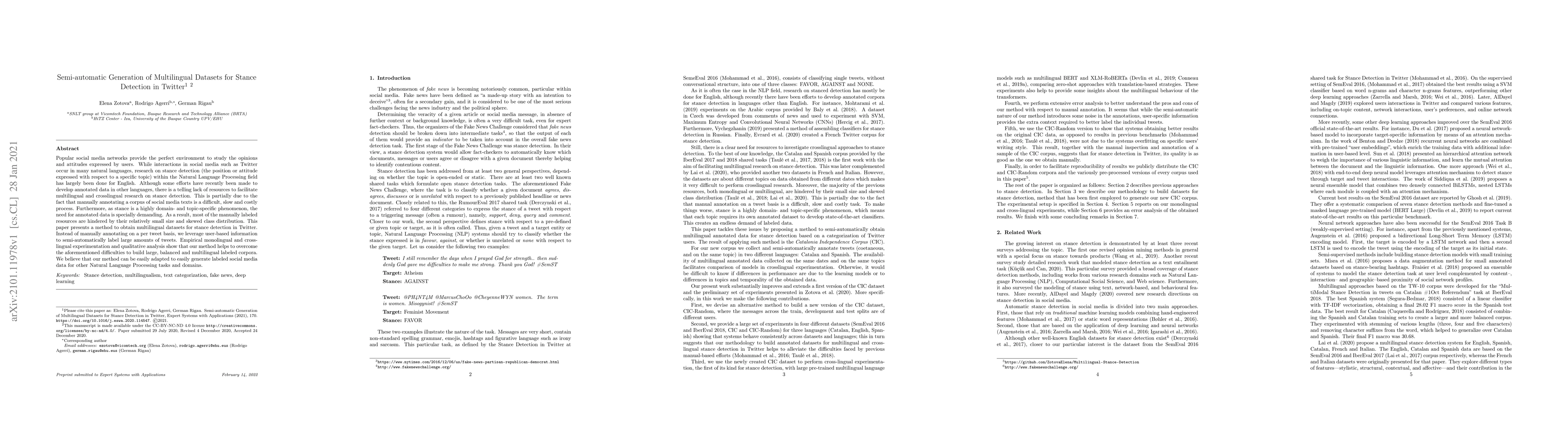 This paper proposes a semi-automatic method to generate large, balanced multilingual datasets for stance detection on Twitter, leveraging user-based information instead of per tweet annotation. The approach aims to overcome the challenges of manually annotating social media data and can facilitate cross-lingual research.