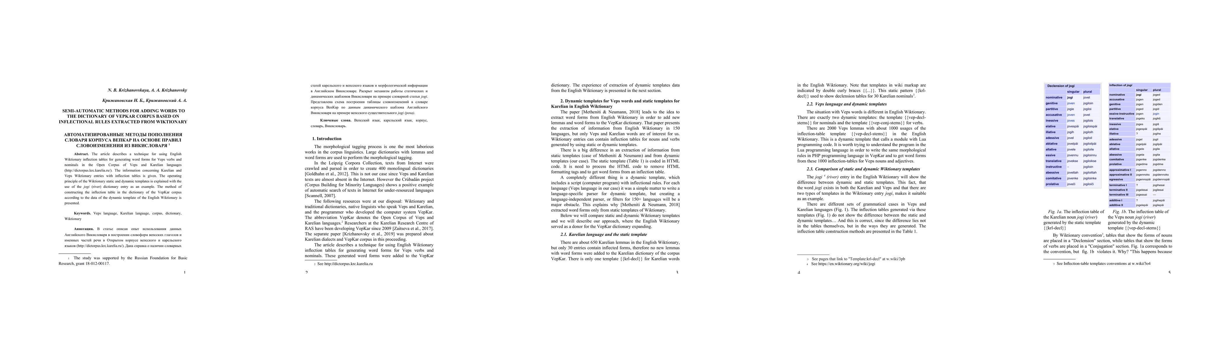 The article describes a technique for using English Wiktionary inflection tables for generating word forms for Veps verbs and nominals in the Open corpus of Veps and Karelian languages. The information concerning Karelian and Veps Wiktionary entries with inflection tables is given. The operating principle of the Wiktionary static and dynamic templates is explained with the use of the jogi (river) dictionary entry as an example. The method of constructing the inflection table in the dictionary of the VepKar corpus according to the data of the dynamic template of the English Wiktionary is presented.