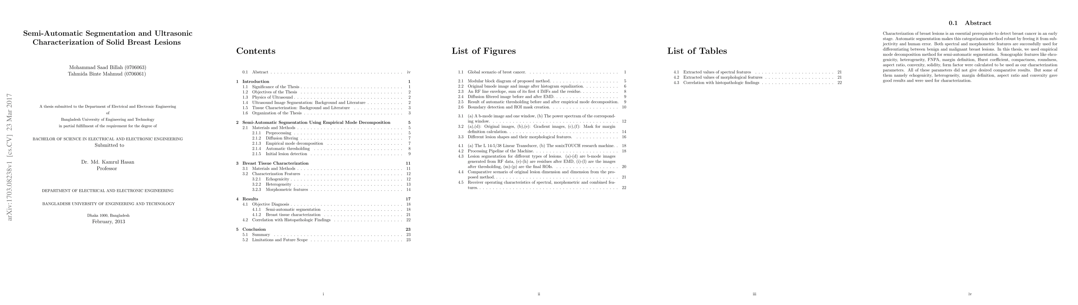 This paper presents a semi-automatic segmentation method using empirical mode decomposition for characterizing solid breast lesions, employing sonographic features to differentiate between benign and malignant tumors. Echogenicity, heterogeneity, margin definition, aspect ratio, and convexity proved most effective for accurate characterization.
