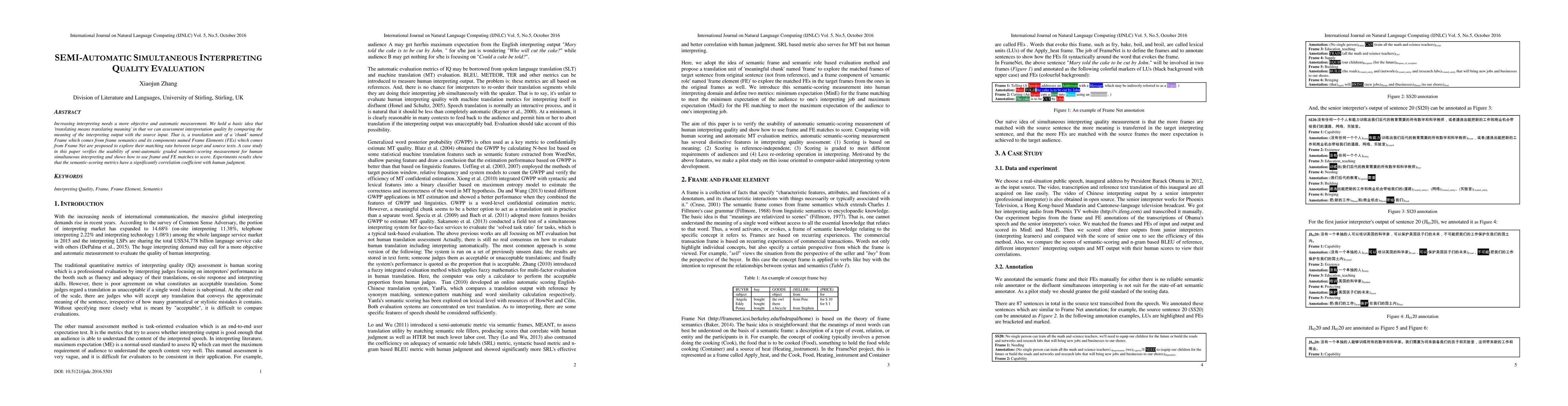 Researchers developed a semi-automatic method to evaluate simultaneous interpreting quality by comparing source and target texts using frame semantics and frame elements, achieving significant correlation with human judgment.