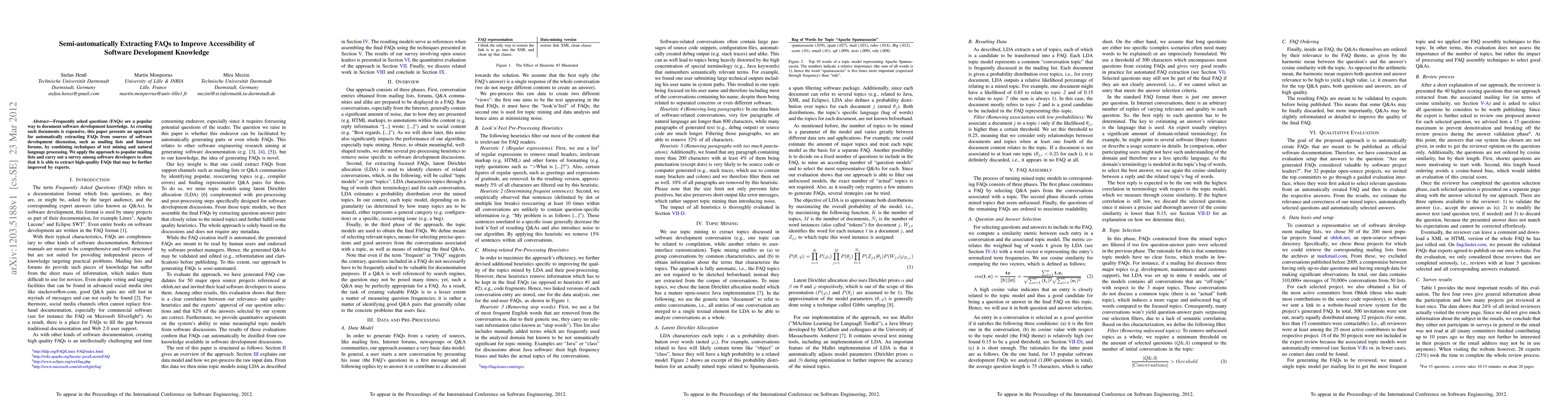 This paper proposes a method to automatically extract FAQs on software development from online discussions like mailing lists and forums using text mining and NLP. The approach yields high-quality FAQs, which can be refined by experts, as confirmed by a survey of software developers.