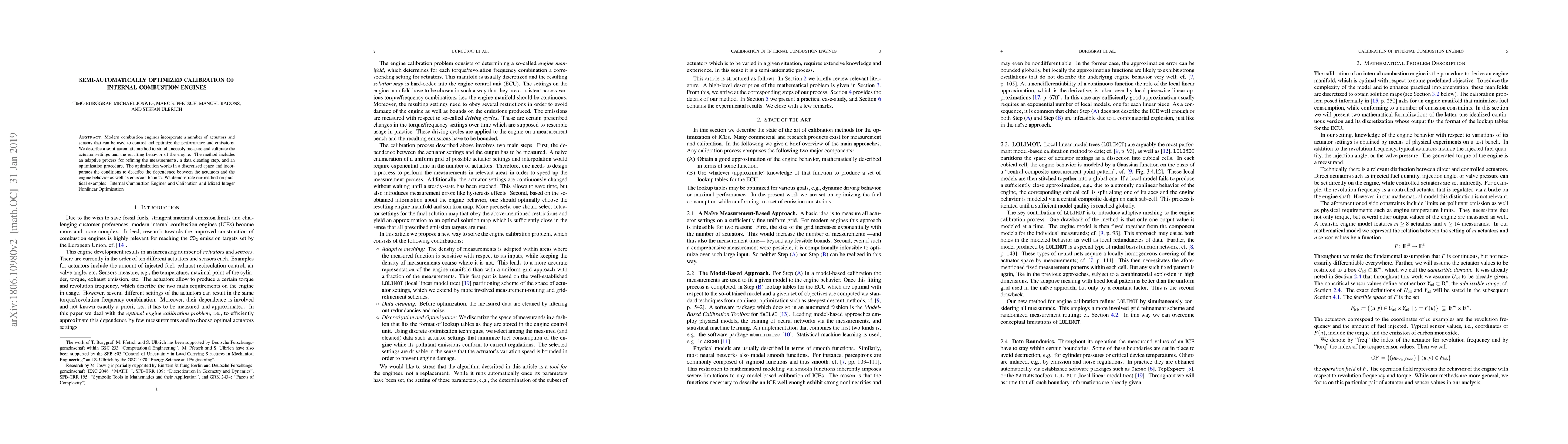 This paper presents a semi-automatic method for calibrating internal combustion engine actuators and engine behavior using adaptive measurements, data cleaning, and optimization. The approach considers actuator settings, engine performance, and emission constraints, demonstrated with practical examples.