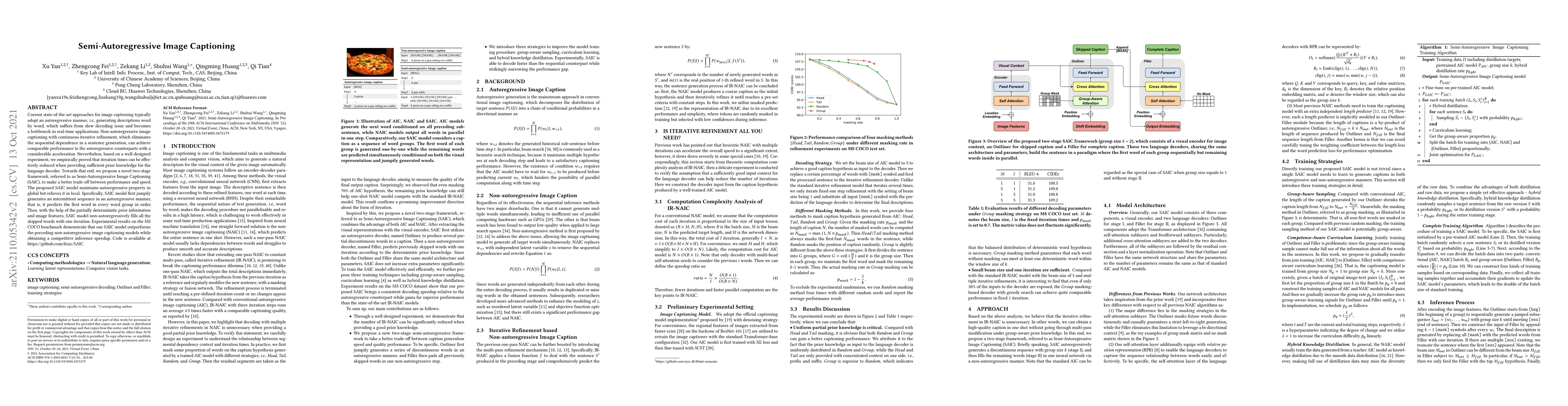 The paper proposes Semi-Autoregressive Image Captioning (SAIC), a two-stage framework that combines autoregressive and non-autoregressive methods to improve both captioning performance and speed. SAIC generates an initial sequence in an autoregressive manner and then refines it non-autoregressively, achieving better results than non-autoregressive models while speeding up inference.