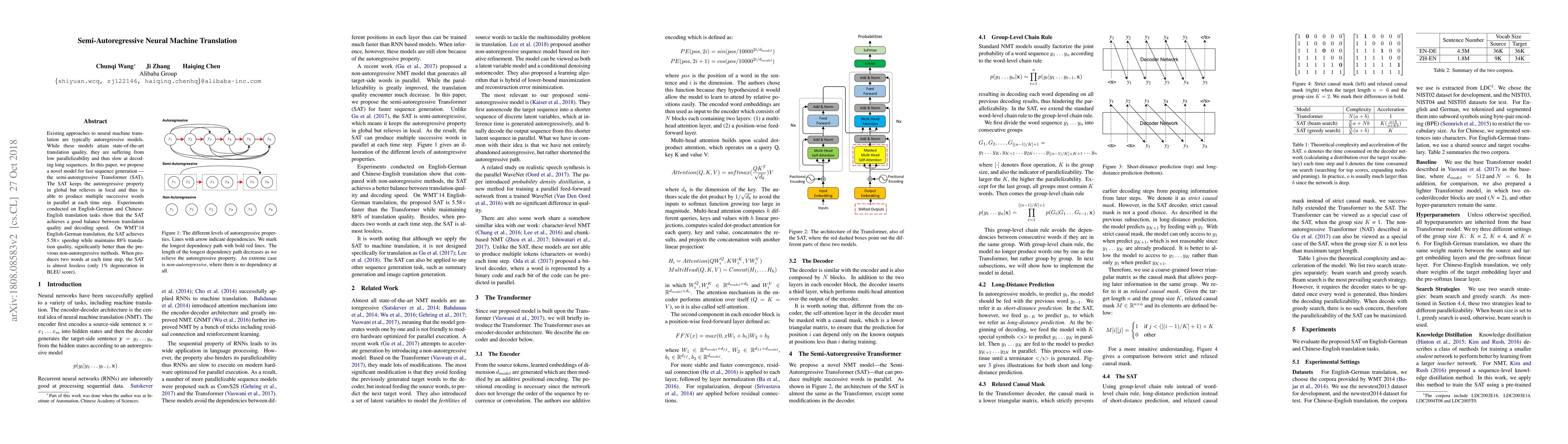 The paper proposes a semi-autoregressive Transformer model for neural machine translation that maintains global autoregressive properties while enabling local parallelization, achieving significant speedups with minimal loss in translation quality. Experiments on English-German and Chinese-English translations show a 5.58× speedup on WMT'14 with 88% of original translation quality.