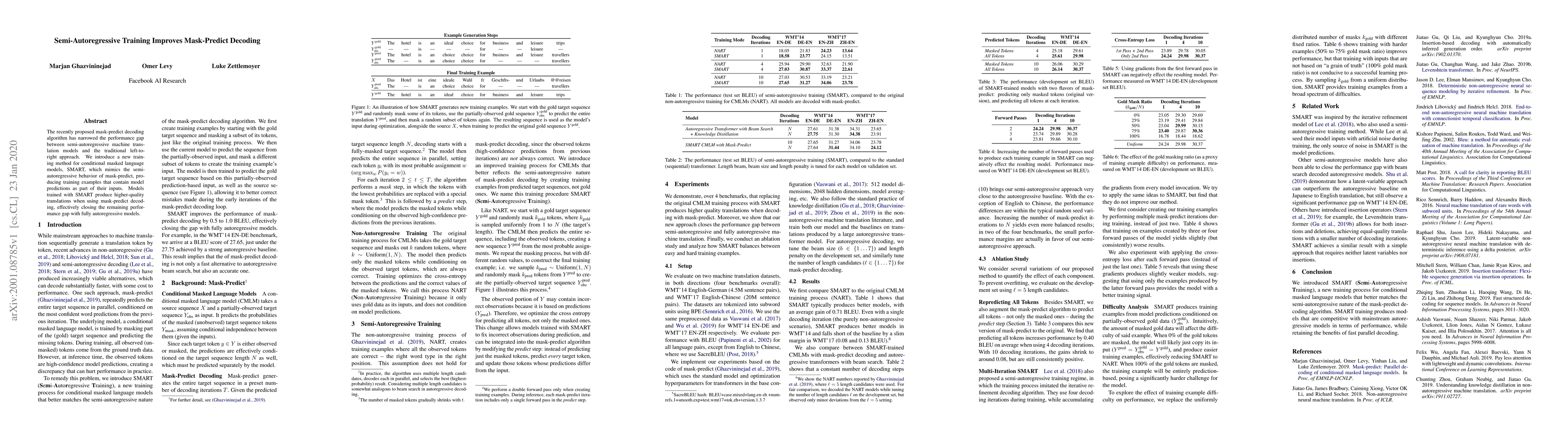 The paper proposes SMART, a semi-autoregressive training method for conditional masked language models, which enhances the mask-predict decoding algorithm, leading to higher-quality translations and closing the performance gap with fully autoregressive models.