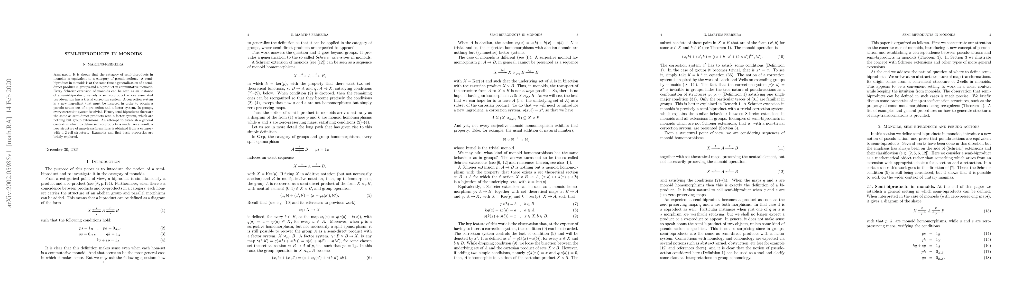 It is shown that the category of semi-biproducts in monoids is equivalent to a category of pseudo-actions. A semi-biproduct in monoids is at the same time a generalization of a semi-direct product in groups and a biproduct in commutative monoids. Every Schreier extension of monoids can be seen as an instance of a semi-biproduct; namely a semi-biproduct whose associated pseudo-action has a trivial correction system. A correction system is a new ingredient that must be inserted in order to obtain a pseudo-action out of a pre-action and a factor system. In groups, every correction system is trivial. Hence, semi-biproducts there are the same as semi-direct products with a factor system, which are nothing but group extensions. An attempt to establish a general context in which to define semi-biproducts is made. As a result, a new structure of map-transformations is obtained from a category with a 2-cell structure. Examples and first basic properties are briefly explored.