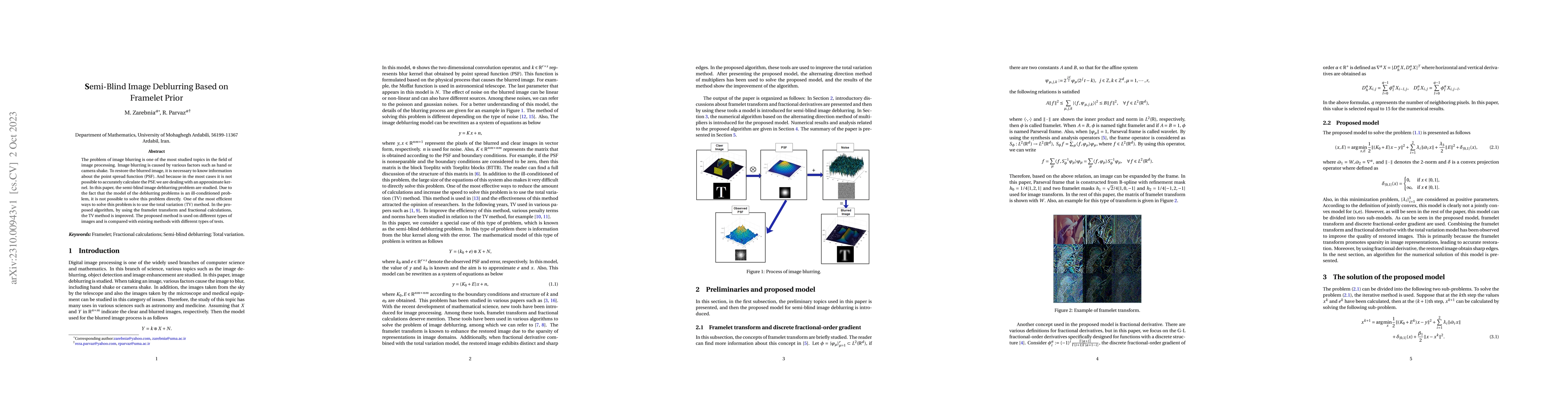 This paper proposes a semi-blind image deblurring method using framelet prior and total variation (TV) to address the ill-conditioned nature of deblurring problems. The method improves the TV approach through framelet transform and fractional calculations, and is tested against existing methods.