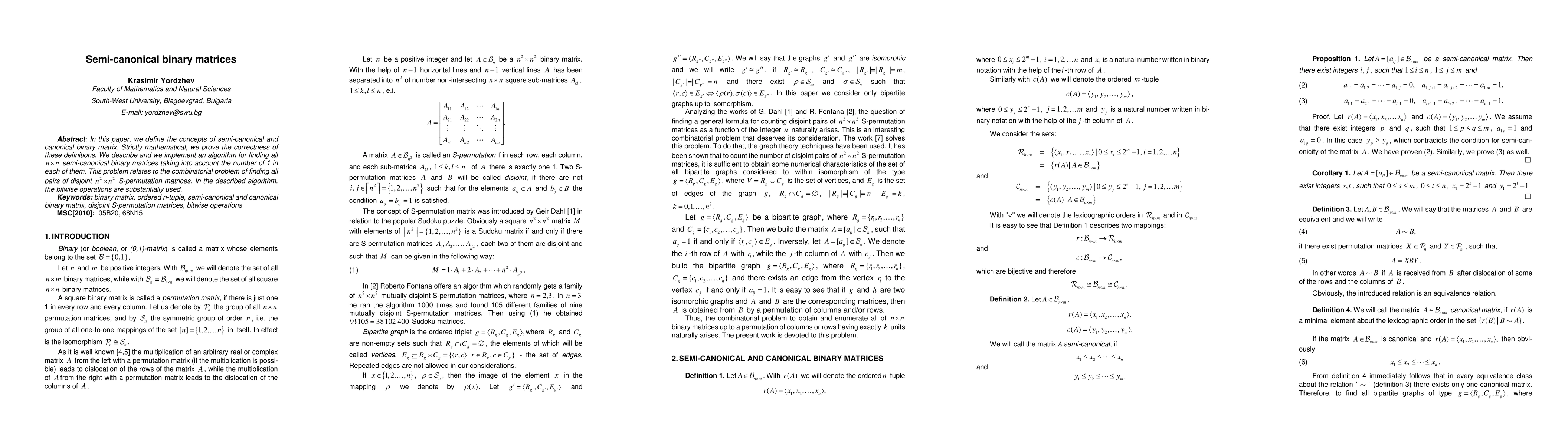 This paper defines semi-canonical and canonical binary matrices, proving their correctness mathematically. It presents an algorithm utilizing bit-wise operations to find all semi-canonical binary matrices based on the number of 1s, relating to the combinatorial problem of disjoint S-permutation matrices.