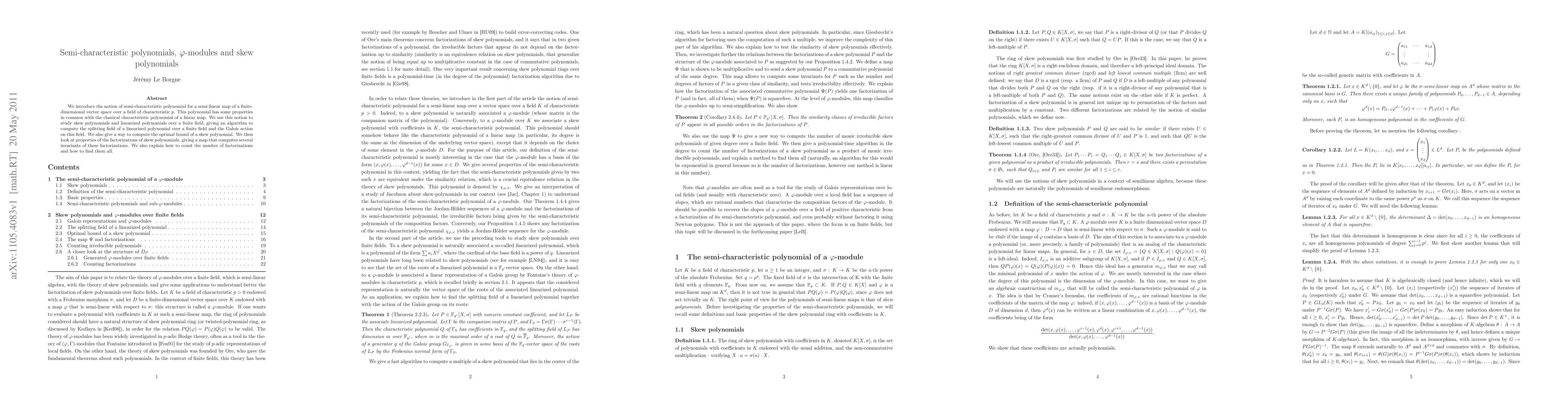 We introduce the notion of semi-characteristic polynomial for a semi-linear map of a finite- dimensional vector space over a field of characteristic p. This polynomial has some properties in common with the classical characteristic polynomial of a linear map. We use this notion to study skew polynomials and linearized polynomials over a finite field, giving an algorithm to compute the splitting field of a linearized polynomial over a finite field and the Galois action on this field. We also give a way to compute the optimal bound of a skew polynomial. We then look at properties of the factorizations of skew polynomials, giving a map that computes several invariants of these factorizations. We also explain how to count the number of factorizations and how to find them all.