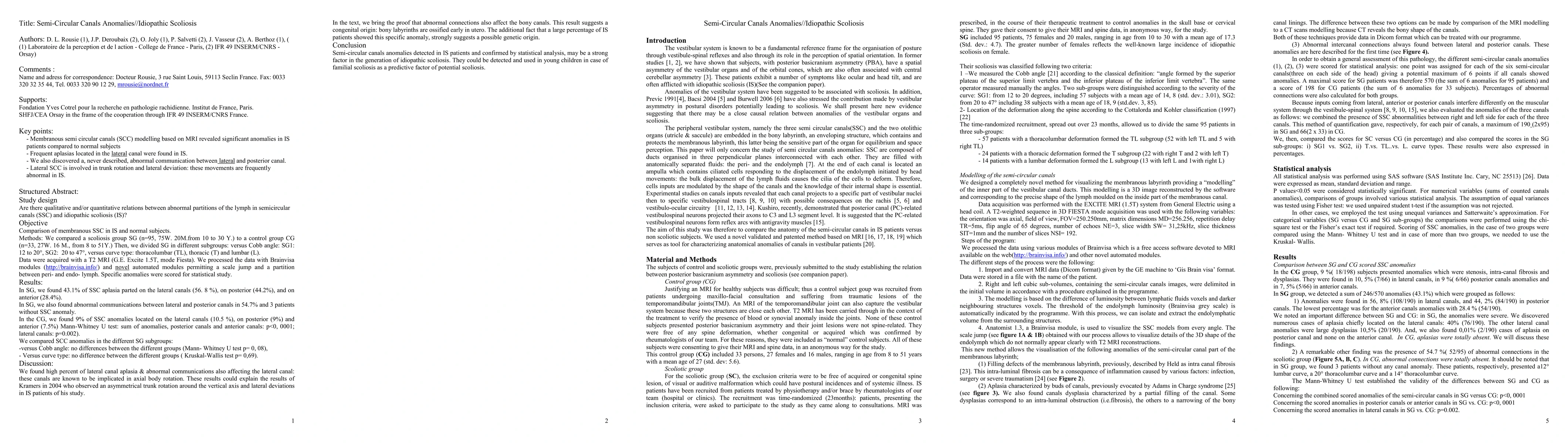 Thanks to a novel modelling programme to detect anomalies in the membranous semi circular canals (SSC) of idiopathic scoliosis (IS) we found severe anomalies mainly located in lateral SCC devoted to trunk rotation and lateral deviations. We also found a specific communication between the lateral and posterior canal involving the utricular chamber which is also highly suspected in scoliosis. Key points: - Membranous semi circular canals (SCC) modelling based on MRI revealed significant anomalies in IS patients compared to normal subjects. - Frequent aplasias located in the lateral canal were found in IS. - We also discovered a, never described, abnormal communication between lateral and posterior canal. - Lateral SCC is involved in trunk rotation and lateral deviation: these movements are frequently abnormal in IS. Supports: Fondation Yves Cotrel pour la recherche en pathologie rachidienne. Institut de France, Paris. SHFJ/CEA Orsay in the frame of the cooperation through IFR 49 INSERM/CNRS France.