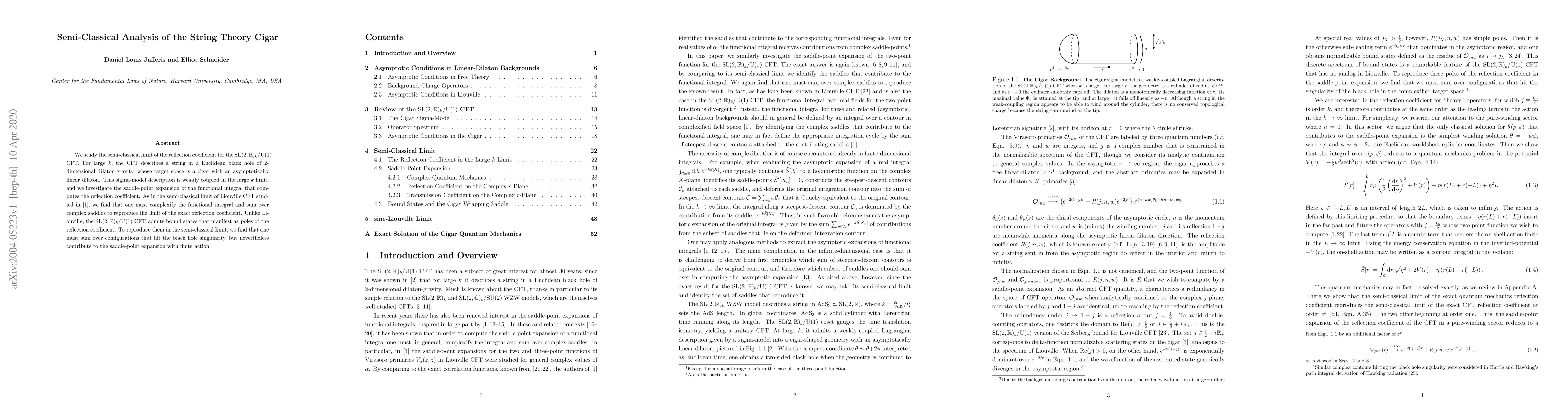 We study the semi-classical limit of the reflection coefficient for the SL(2,R)_k/U(1) CFT. For large k, the CFT describes a string in a Euclidean black hole of 2-dimensional dilaton-gravity, whose target space is a cigar with an asymptotically linear dilaton. This sigma-model description is weakly coupled in the large k limit, and we investigate the saddle-point expansion of the functional integral that computes the reflection coefficient. As in the semi-classical limit of Liouville CFT, we find that one must complexify the functional integral and sum over complex saddles to reproduce the limit of the exact reflection coefficient. Unlike Liouville, the SL(2,R)_k/U(1) CFT admits bound states that manifest as poles of the reflection coefficient. To reproduce them in the semi-classical limit, we find that one must sum over configurations that hit the black hole singularity, but nevertheless contribute to the saddle-point expansion with finite action.