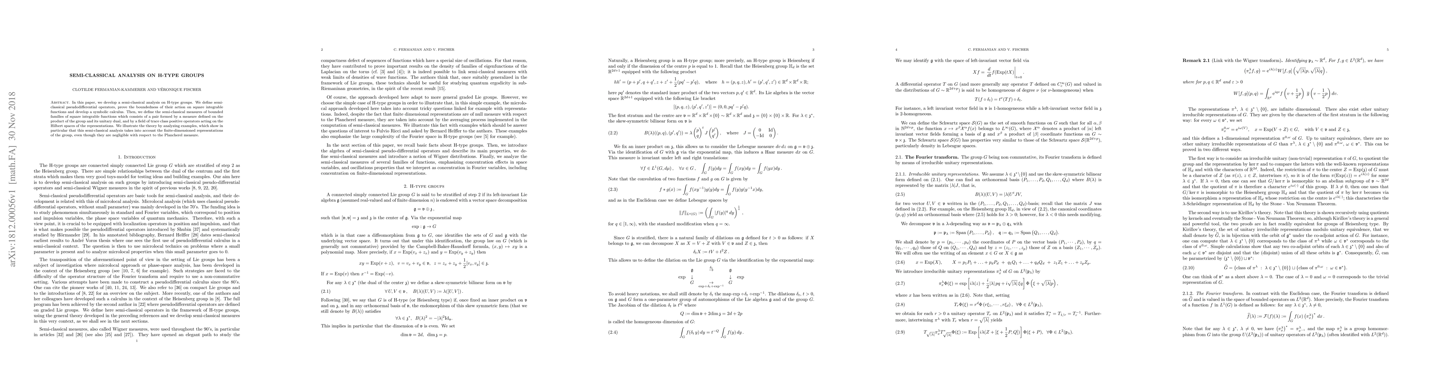 This paper develops a semi-classical analysis on H-type groups, defining pseudodifferential operators and measures that account for finite-dimensional representations of the group.
