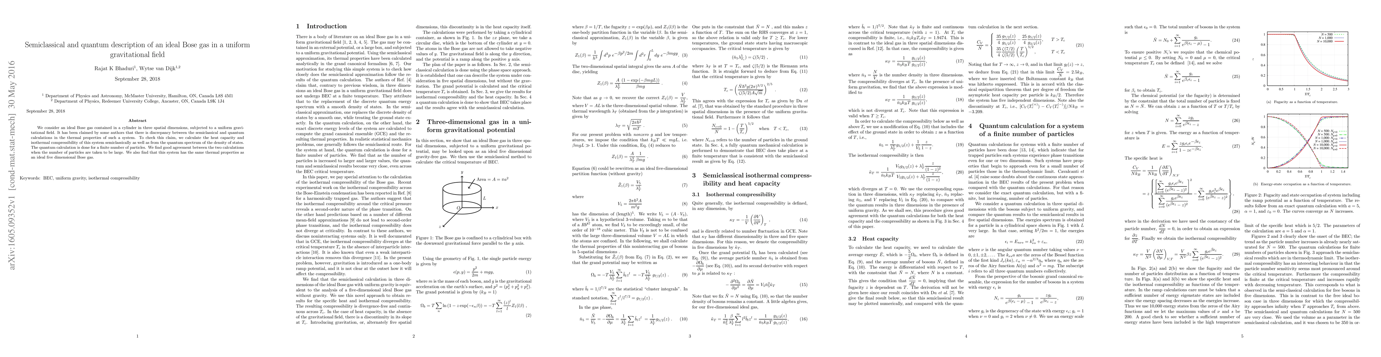 We consider an ideal Bose gas contained in a cylinder in three spatial dimensions, subjected to a uniform gravitational field. It has been claimed by some authors that there is discrepancy between the semi-classical and quantum calculations in the thermal properties of such a system. To check this claim, we calculate the heat capacity and isothermal compressibility of this system semi-classically as well as from the quantum spectrum of the density of states. The quantum calculation is done for a finite number of particles. We find good agreement between the two calculations when the number of particles are taken to be large. We also find that this system has the same thermal properties as an ideal five dimensional Bose gas.
