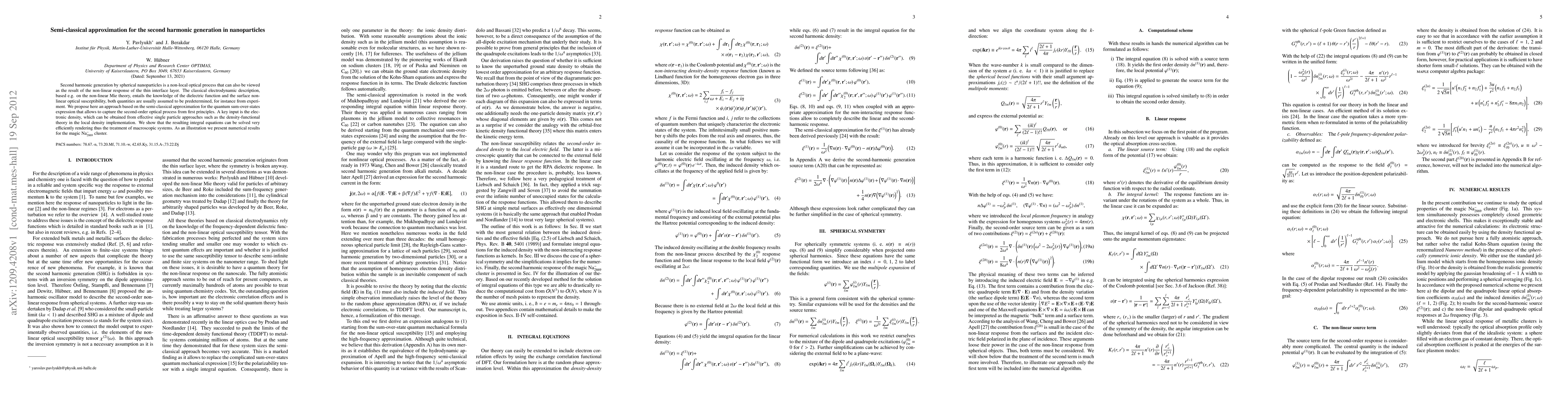 This paper proposes a semi-classical approximation to model second harmonic generation in spherical nanoparticles, deriving the process from first principles using quantum sum-over-states expressions and electronic density from density-functional theory. The approach efficiently solves integral equations, enabling the treatment of macroscopic systems, as demonstrated with the Na2869 cluster.